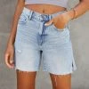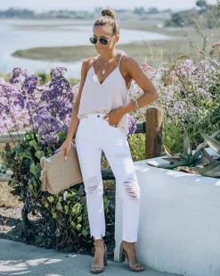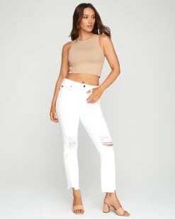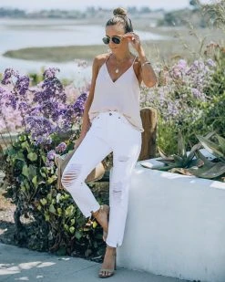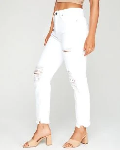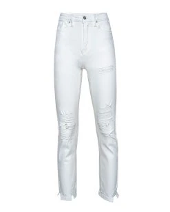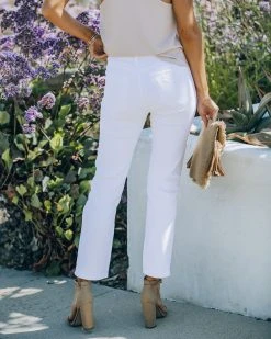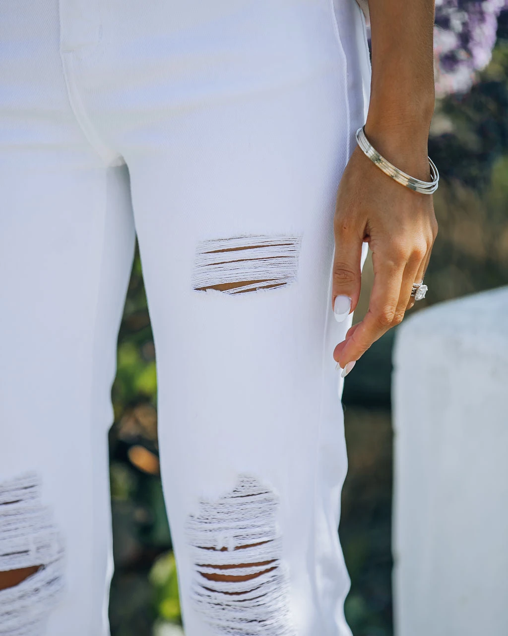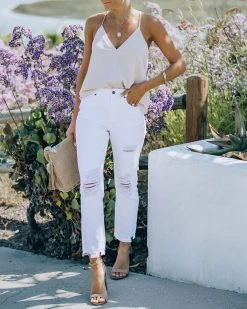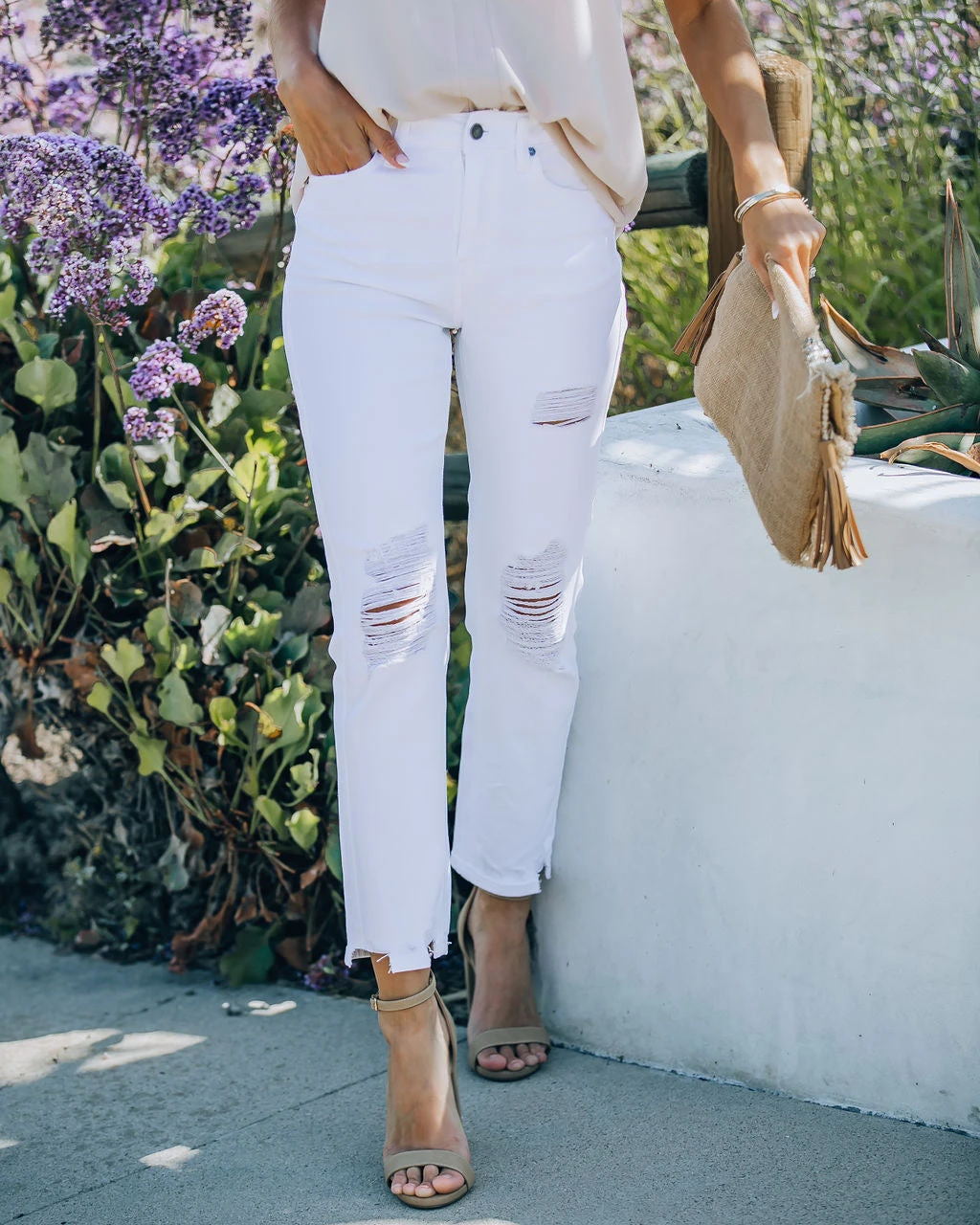 //Best Seller// Our Brenna High Rise Distressed Slim Straight Denim are the perfect summer pant! These white denim jeans are high rise with a distressed fabric.