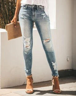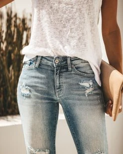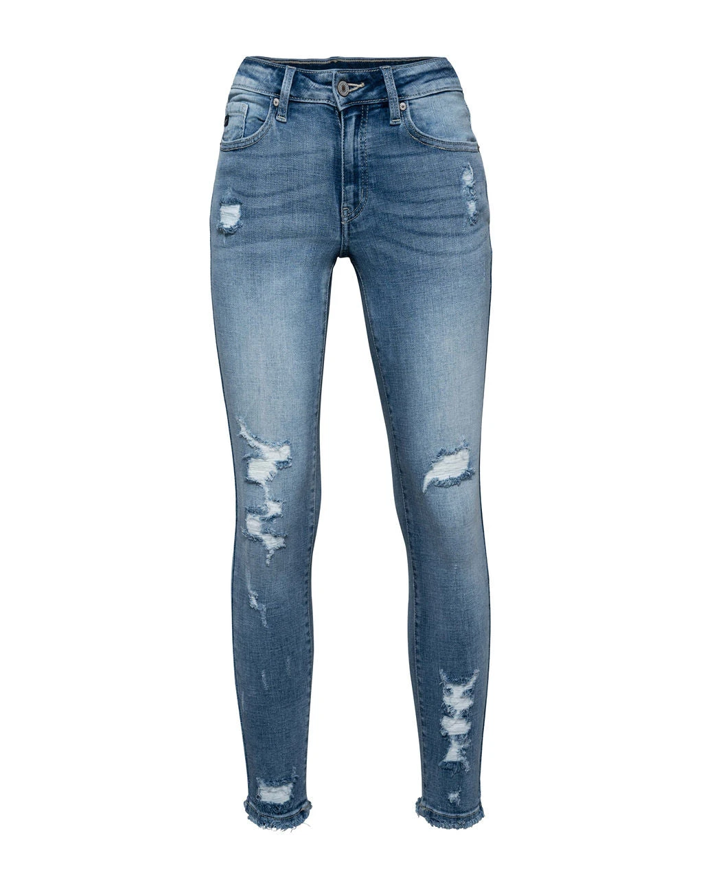 //Best Seller//Restocked// The Carly Distressed Skinny features a light to medium wash finish and mid rise fit. Fashioned with front/back fading and heavily distressed legs and ankles.