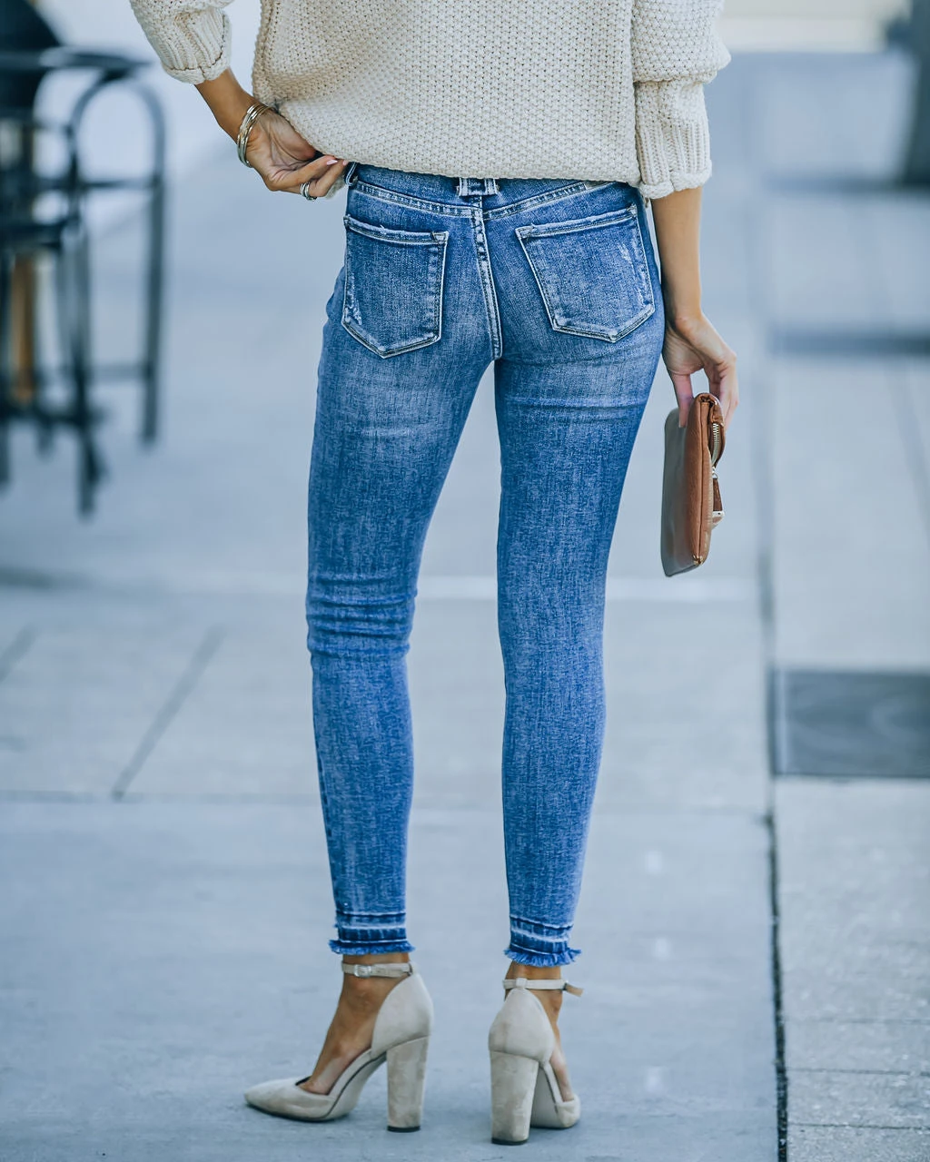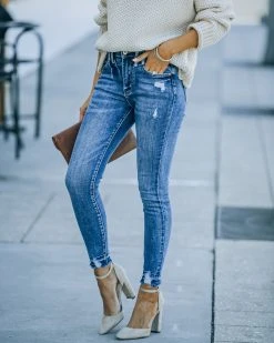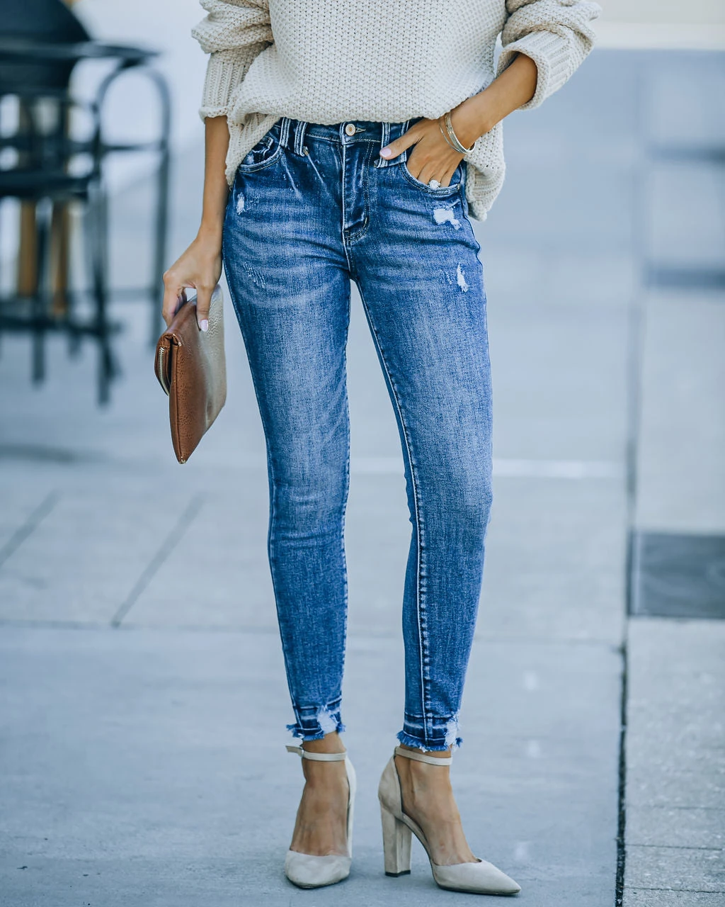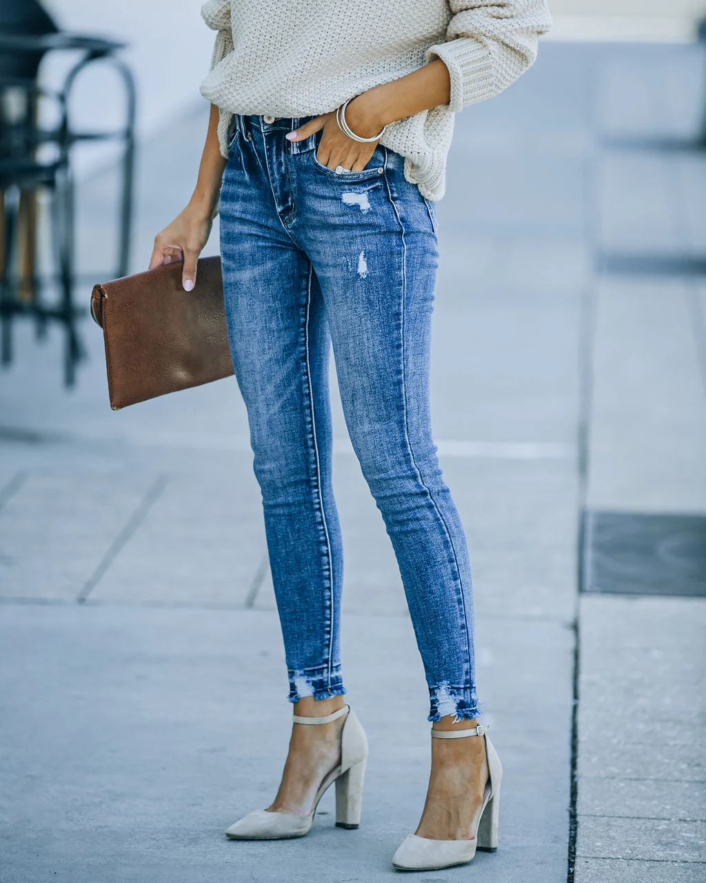 Our Ginny High Rise Distressed Skinny are uber flattering! These medium wash jeans feature distressing details. Designed with a frayed hem and a stretchy feel. Finished with front fly zipper and button closures. Styled with the Perfect Hoop Earrings, Simple Bangle Bracelet, Stella Crossbody Envelope Zip Clutch, Quay Turtleneck Knit Sweater, and Ritz Faux Suede Pointed Heel.