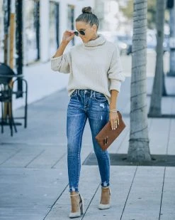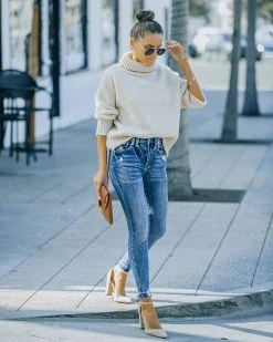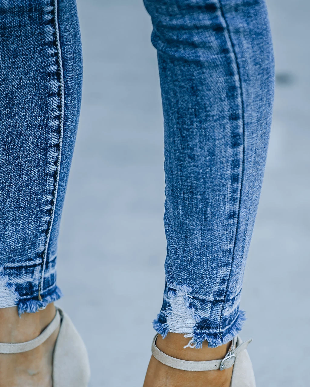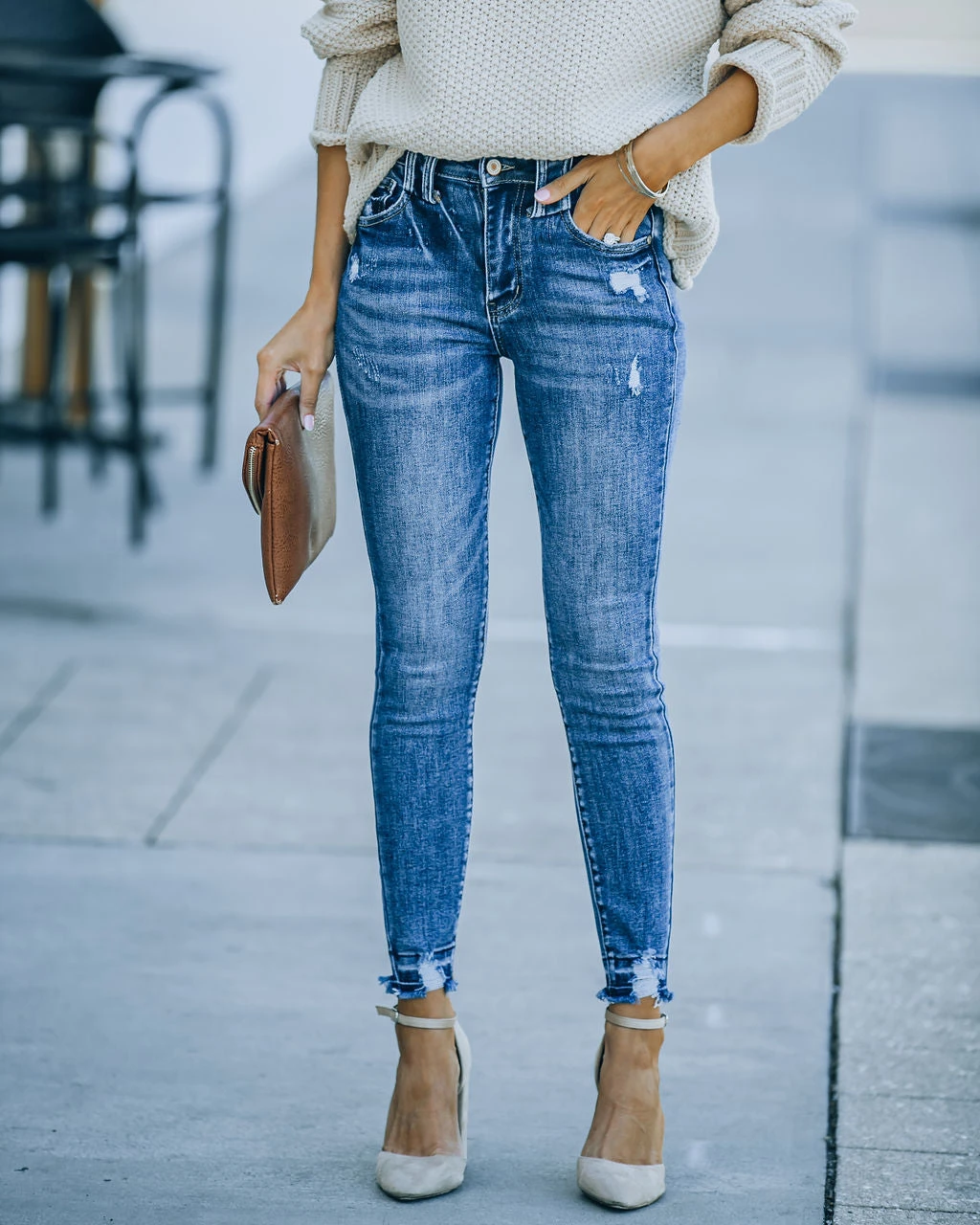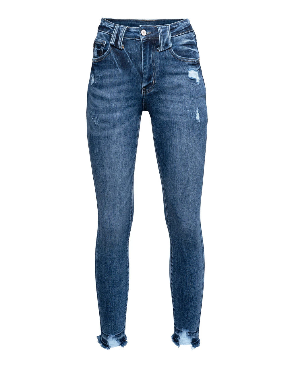 Our Ginny High Rise Distressed Skinny are uber flattering! These medium wash jeans feature distressing details. Designed with a frayed hem and a stretchy feel. Finished with front fly zipper and button closures. Styled with the Perfect Hoop Earrings, Simple Bangle Bracelet, Stella Crossbody Envelope Zip Clutch, Quay Turtleneck Knit Sweater, and Ritz Faux Suede Pointed Heel.