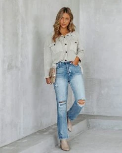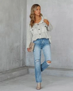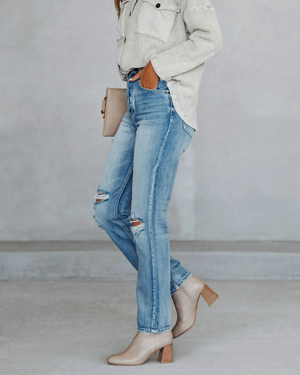 //KanCan Denim// You’ll wear our Jinx High Rise 90’s Boyfriend Denim all year long! With a light wash distressed fabric, straight leg and high rise fit, this denim has endless styling possibilities. Size up in this rigid denim for a true boyfriend style fit! Styled with the Perfect Hoop Earrings, Chloe Mini Necklace, Allister Cotton Thermal Shacket, Colleen Heeled Bootie, and Stella Crossbody Envelope Zip Clutch.