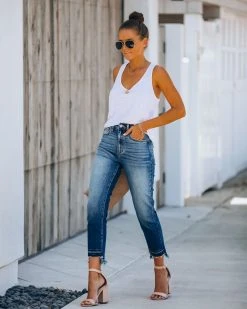 //Kancan Denim// Our Kiara High Rise Frayed Ankle Denim features a dark wash that comes detailed with whiskering + fading along the front and back. Constructed to sit high with a stretchy tapered fit. Subtle back distressing complement the frayed ankle to give the pair some edge. Finished with a classic five pocket style and a front zipper and button closure.