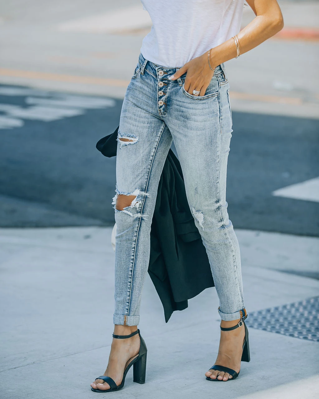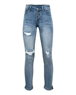 //Best Seller//Kan Can Denim// Our Liberation Distressed Girlfriend Skinny denim jeans set the trend in a Medium wash and button fly front!