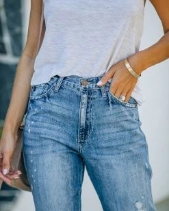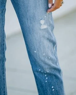 //Kancan Denim// Our Lorelei High Rise Distressed Paint Splatter Mom Jeans will be one of the comfiest jeans you own! These medium wash high rise distressed mom jeans have a white paint splatter and a tapered leg. Finished with classic 5 pockets. Styled with the Chloe Mini Necklace, Compass Coin Necklace, Simple Bangle Bracelet, Mini Highland Bag, Physique Racerback Tank, and Whimsy Heel.