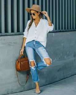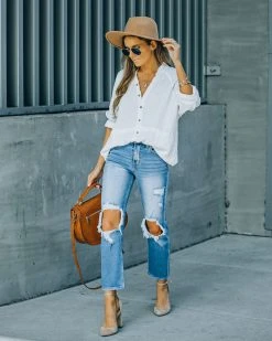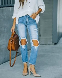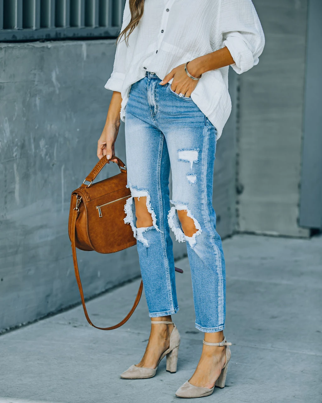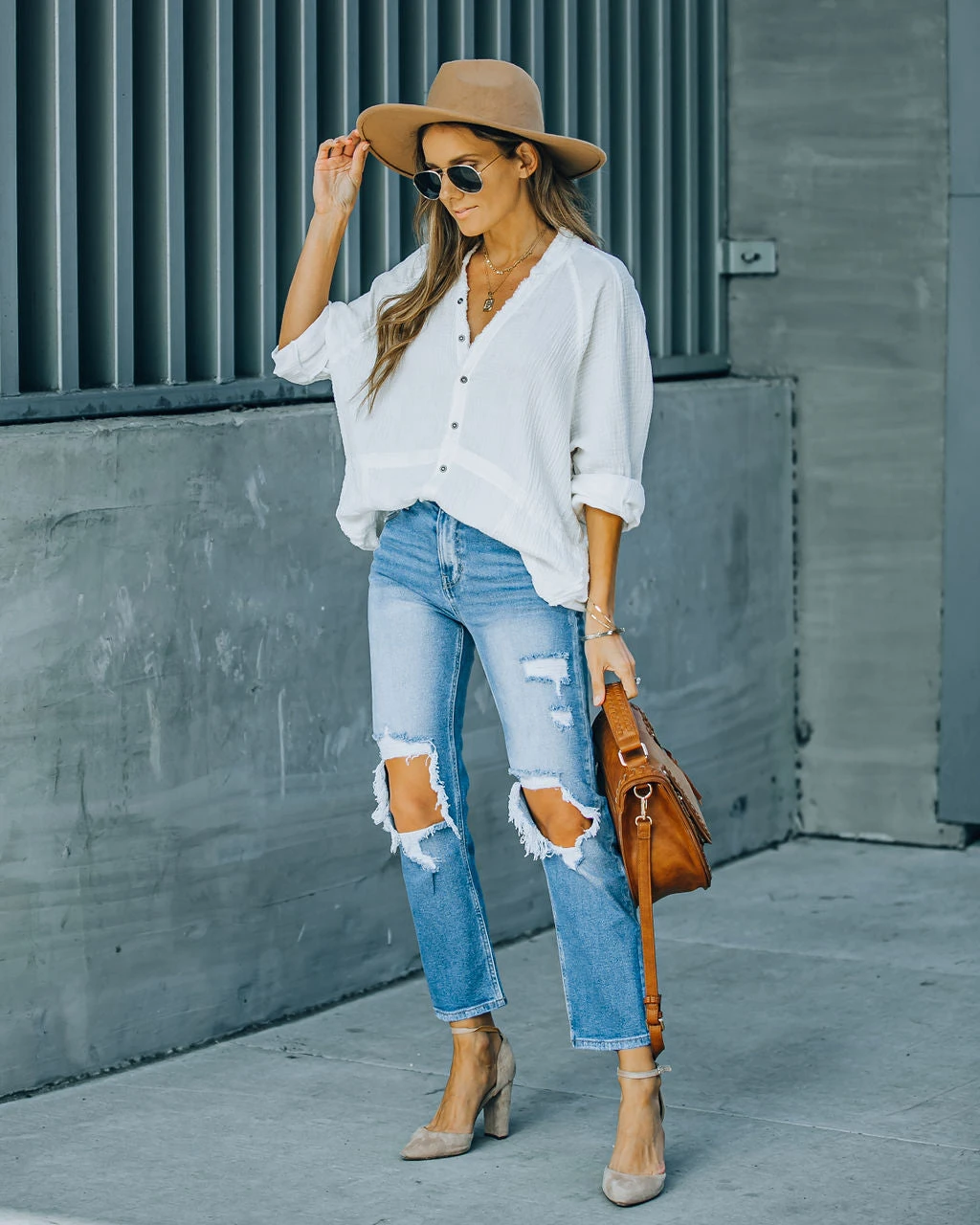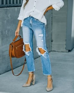 Our Madden High Rise Distressed Straight Leg Denim are perfectly relaxed! These medium wash pants are detailed with a heavy distressing. Designed with a front fly zipper and button closure. Styled with the El Dorado Hat, Chloe Mini Necklace, Initial Card Necklace, Simple Bangle Bracelet, Highland Bag, and Ritz Faux Suede Pointed Heel.