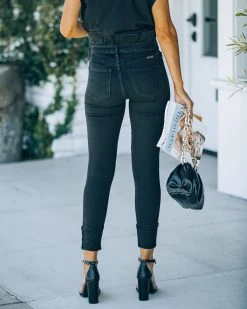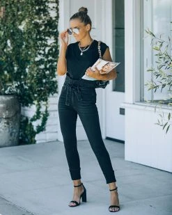 //Best Seller// Kancan Denim// We love the tailored look of our Morrison High Rise Paper Bag Waist Skinny! These best selling black skinnies have a paper bag waist and an adjustable waist tie with a high rise and a classic 5 pockets.