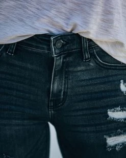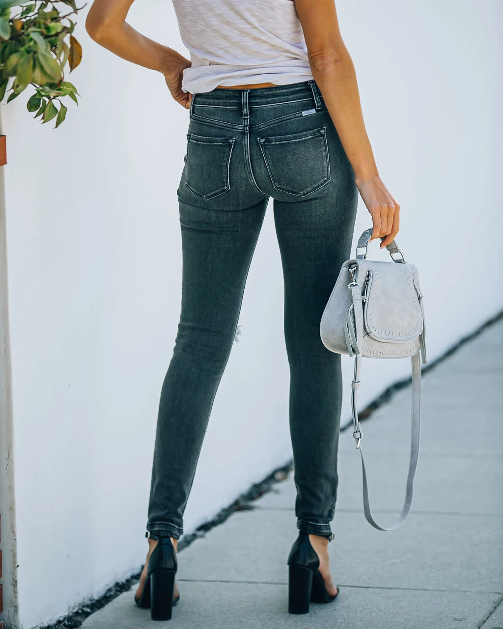 //Best Selling Style// Kancan Denim// Our National Mid Rise Distressed Skinny goes with so many outfits! These grey wash denim jeans are a mid rise with a skinny leg and a distressed style. Finished with classic 5 pockets and a front fly zipper and button closure. Styled with the Paradiso Sunglasses, Daya Links Choker, Chloe Mini Necklace, Compass Coin Necklace, Mini Highland Bag, Physique Racerback Tank, and Whimsy Heel.