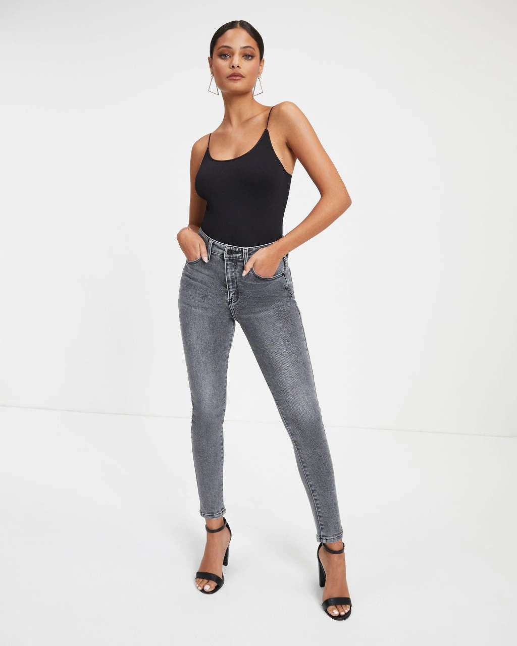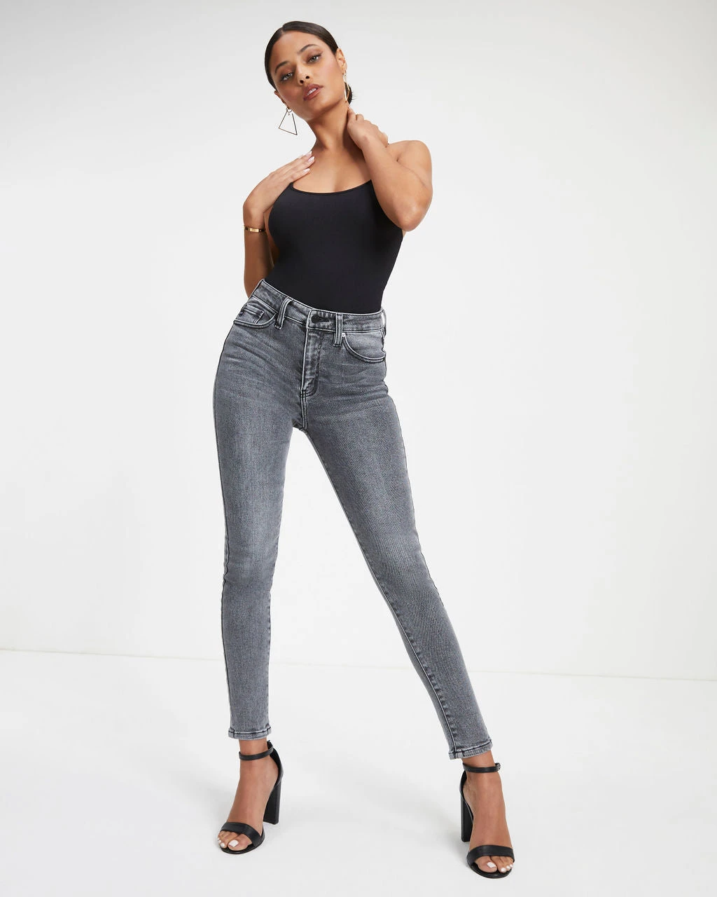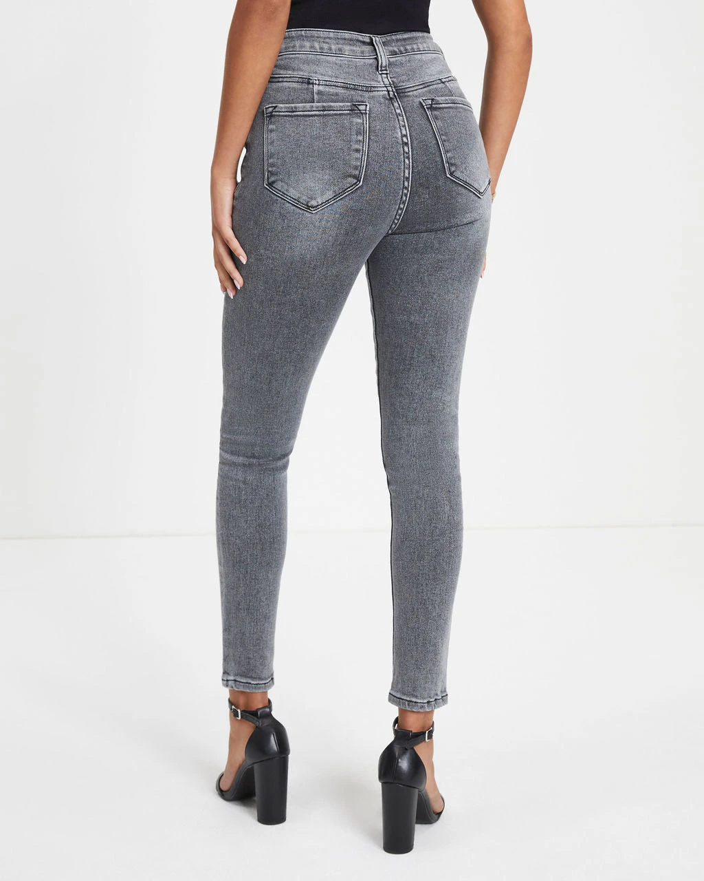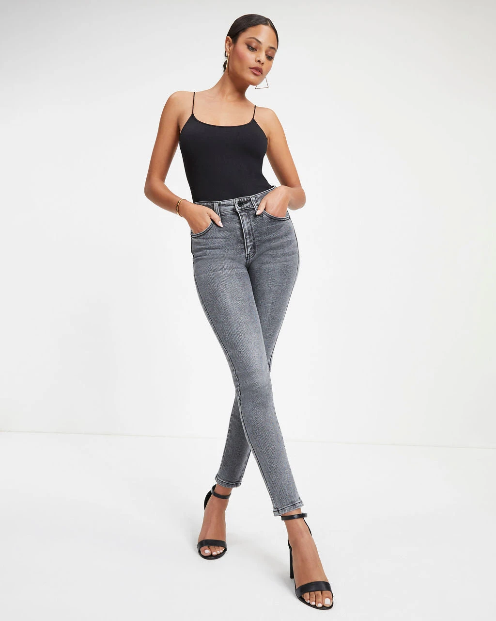 Classic meets flattering in the Population High Rise Skinny in light grey that features a high rise waistband.