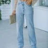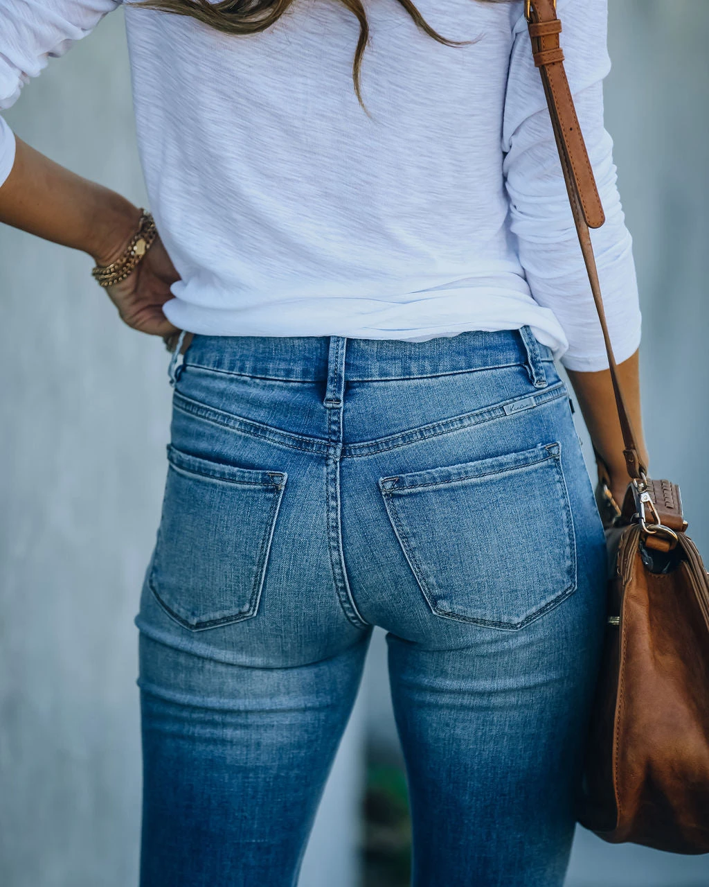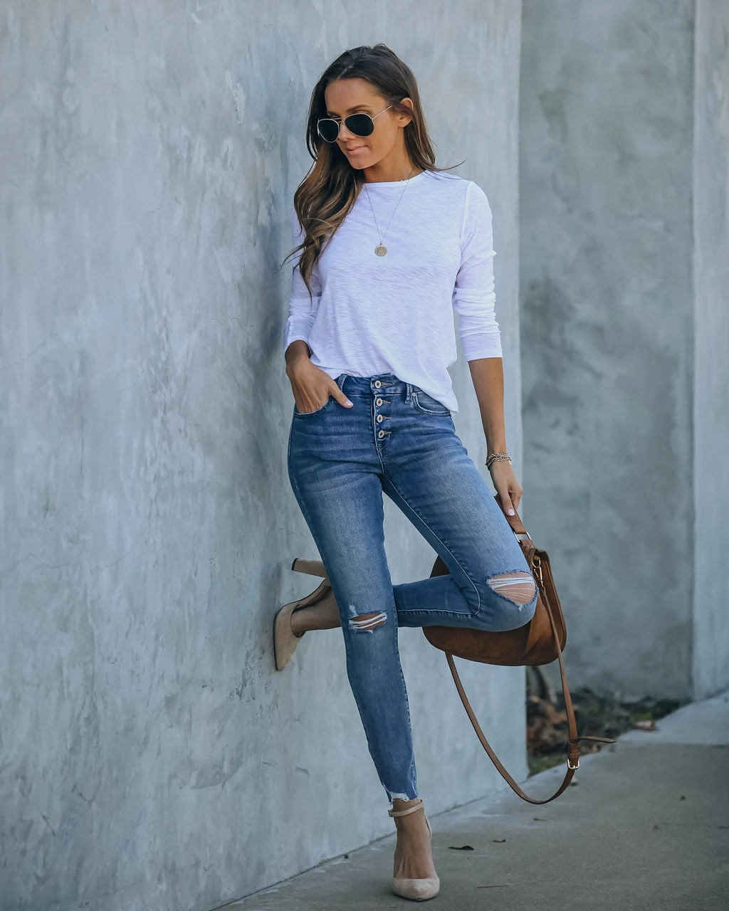 //KanCan Denim// These medium skinny wash jeans are so flattering! Our Rayne High Rise Button Front Frayed Ankle Skinny has front button closures and fading and whiskering with classic 5 pockets. The distressed stretchy fabric on these beauties make them so cool. Styled with the Chloe Mini Necklace, The Buddha Wheel Necklace, Kelsey Chain Bracelet, Highland Bag, Miranda Long Sleeve Top, and Ritz Faux Suede Pointed Heel.