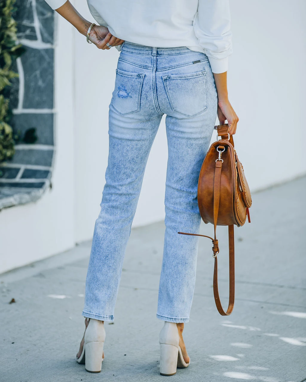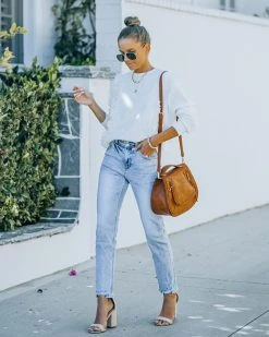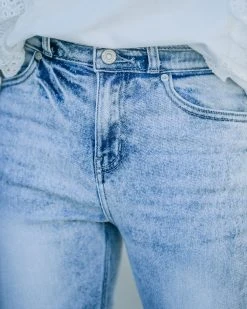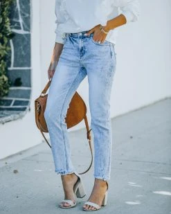 Our Ronny High Rise Slim Straight Denim are an everyday classic! These light wash high rise pants are made of a stretchy fabrication. Designed with a front fly zipper and button closure. Finished with 5 pockets. Styled with the Chloe Mini Necklace, Compass Coin Necklace, Minimal Herringbone Necklace, Simple Bangle Bracelet, Highland Bag, Murrieta Eyelet Trim Pullover, and Whimsy Heel.