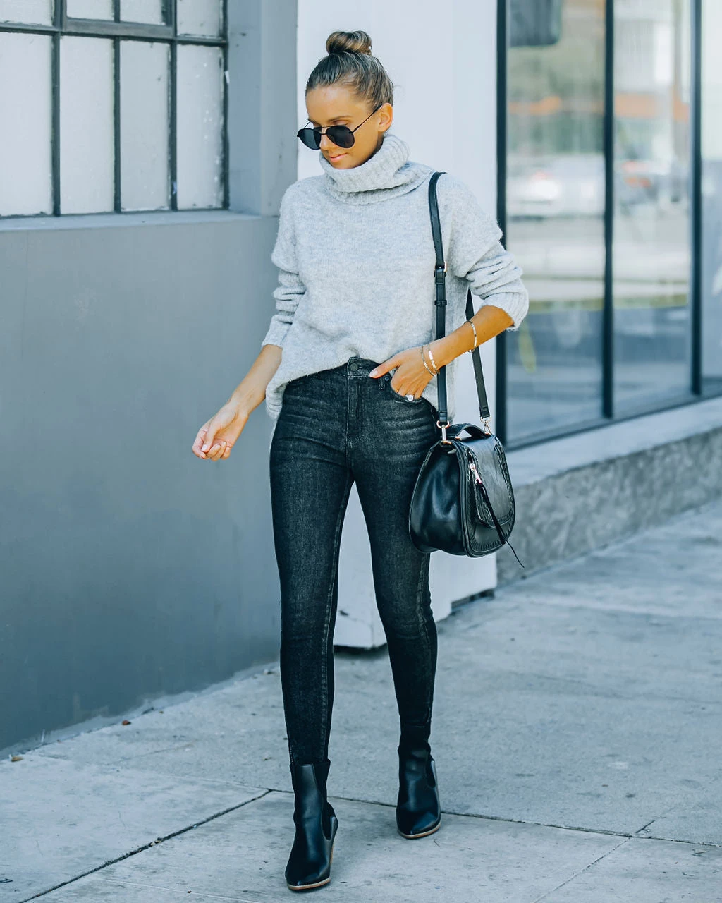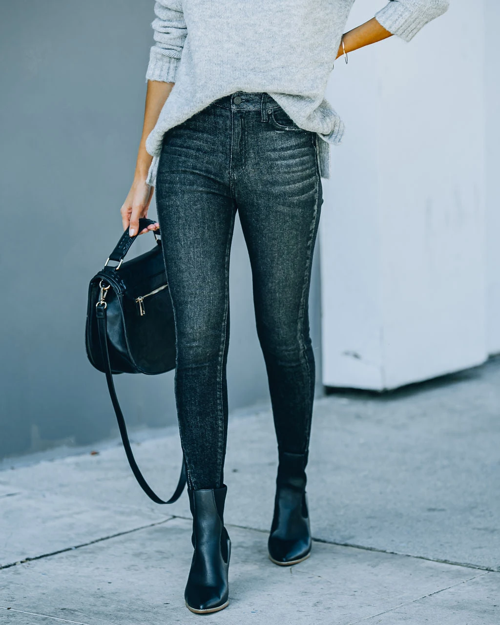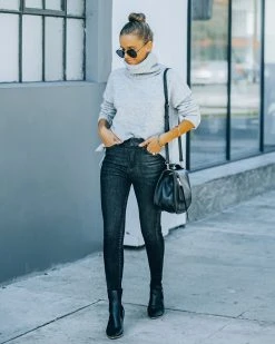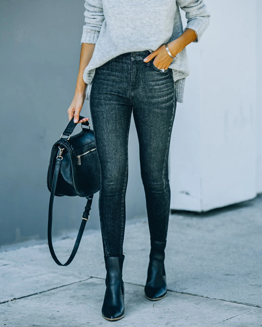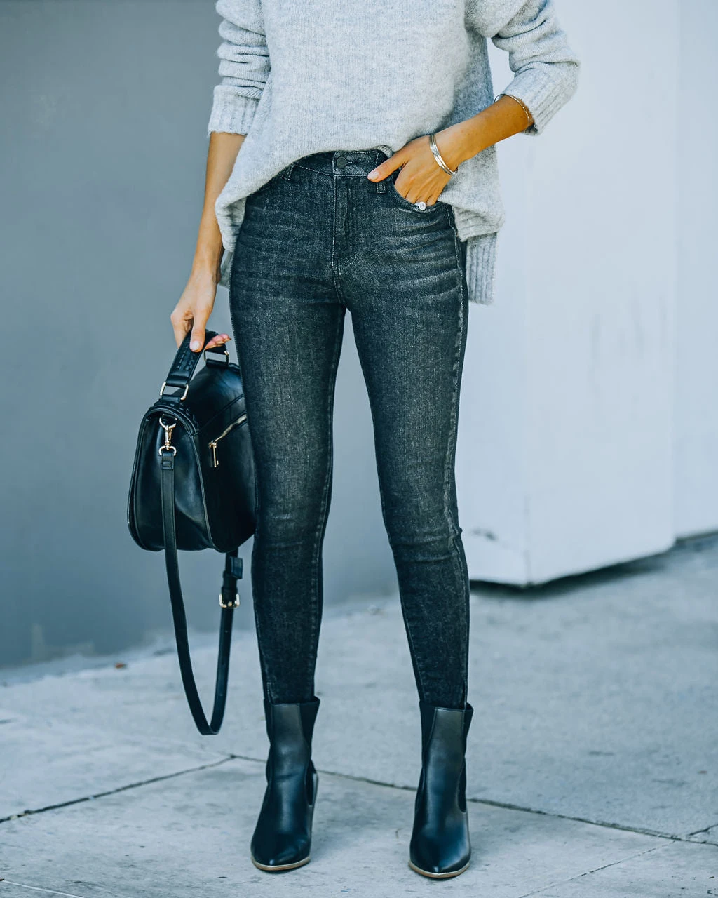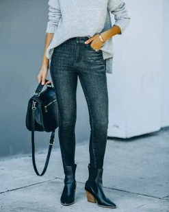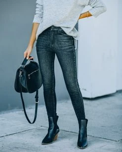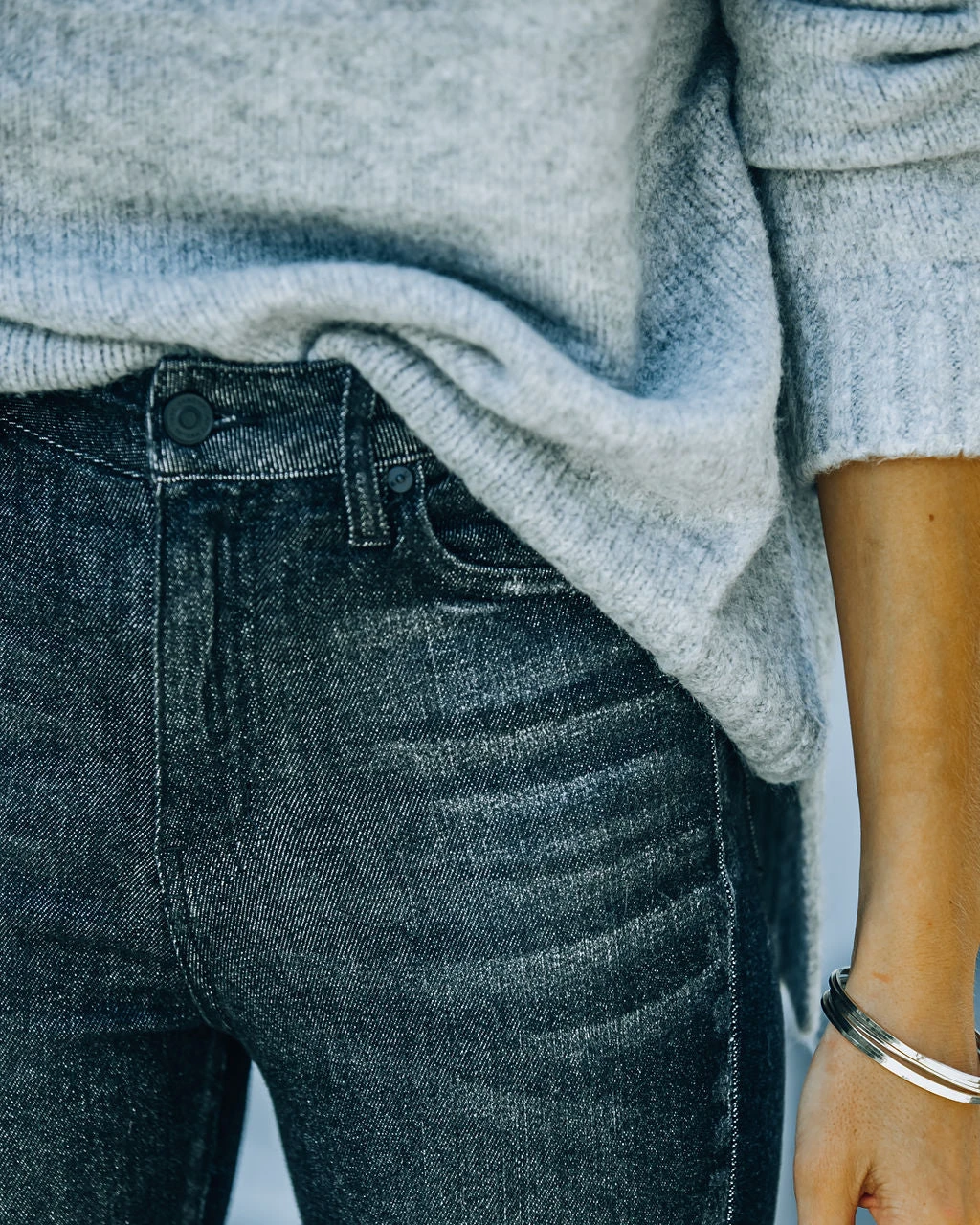 Fitted and flattering is the only way to describe our Strong High Rise Frayed Ankle Skinny! These washed black pants are designed with a light stretch. Finished with a front fly zipper and button closure. Styled with the Lenox Black Frame Grey Gradient Aviator Sunglasses, Simple Bangle Bracelet, Highland Bag, Henry Sweater, and Jocelyn Heeled Bootie.