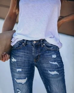 //Best Seller// Fitted and flattering, the Universal Mid Rise Distressed Skinny in a dark wash feature a frayed ankle.