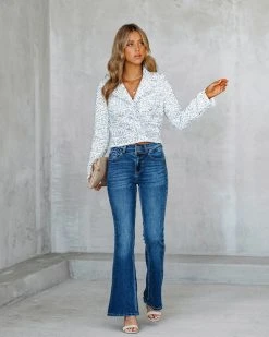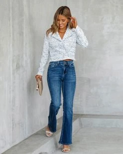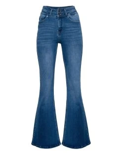 //KanCan Denim// Flare denim is chic right now! Our Vida High Rise Flare Denim come in a medium wash, designed with a wide leg and a stretchy fabrication. Finished with front fly zipper and button closures. Styled with the Perfect Hoop Earrings, Chloe Mini Necklace, Compass Coin Necklace, Leighton Tweed Crop Jacket, Formal Faux Suede Heel, and Stella Crossbody Envelope Zip Clutch.