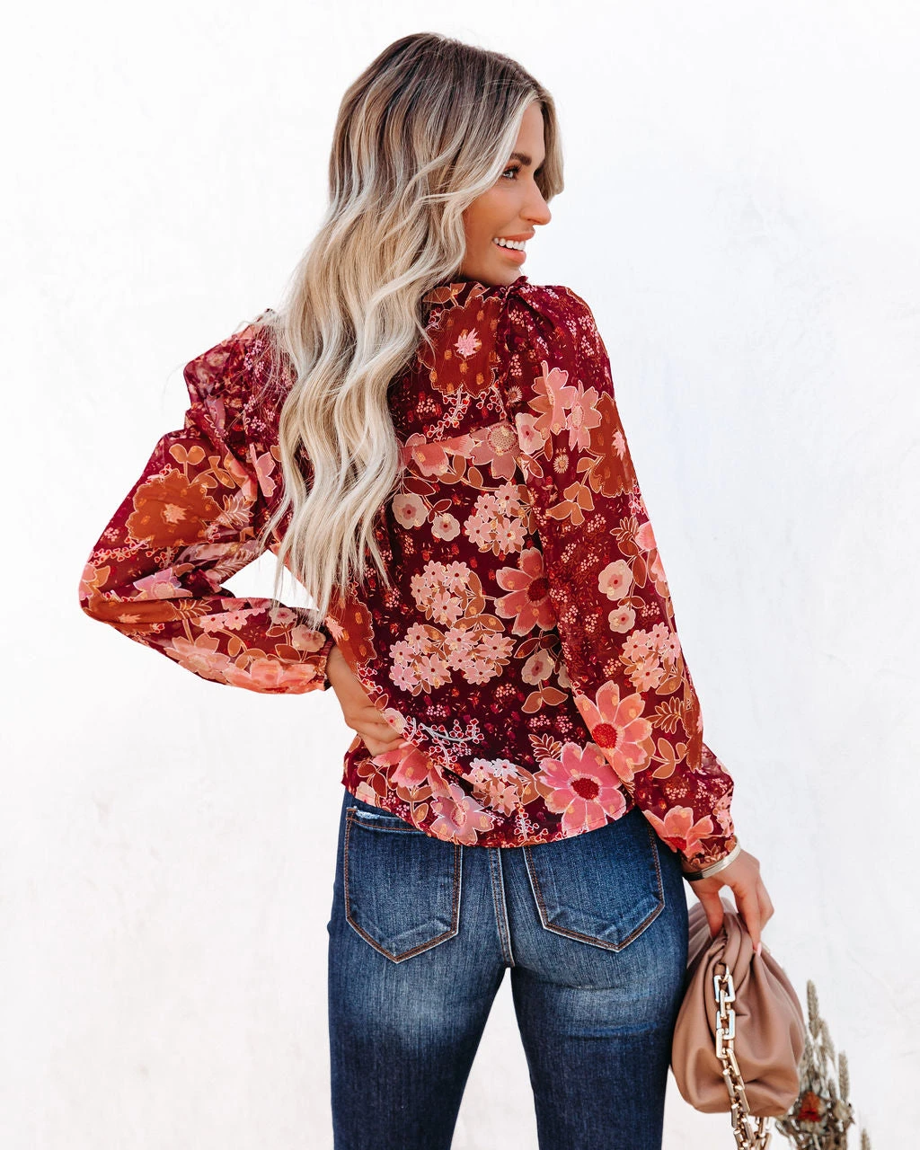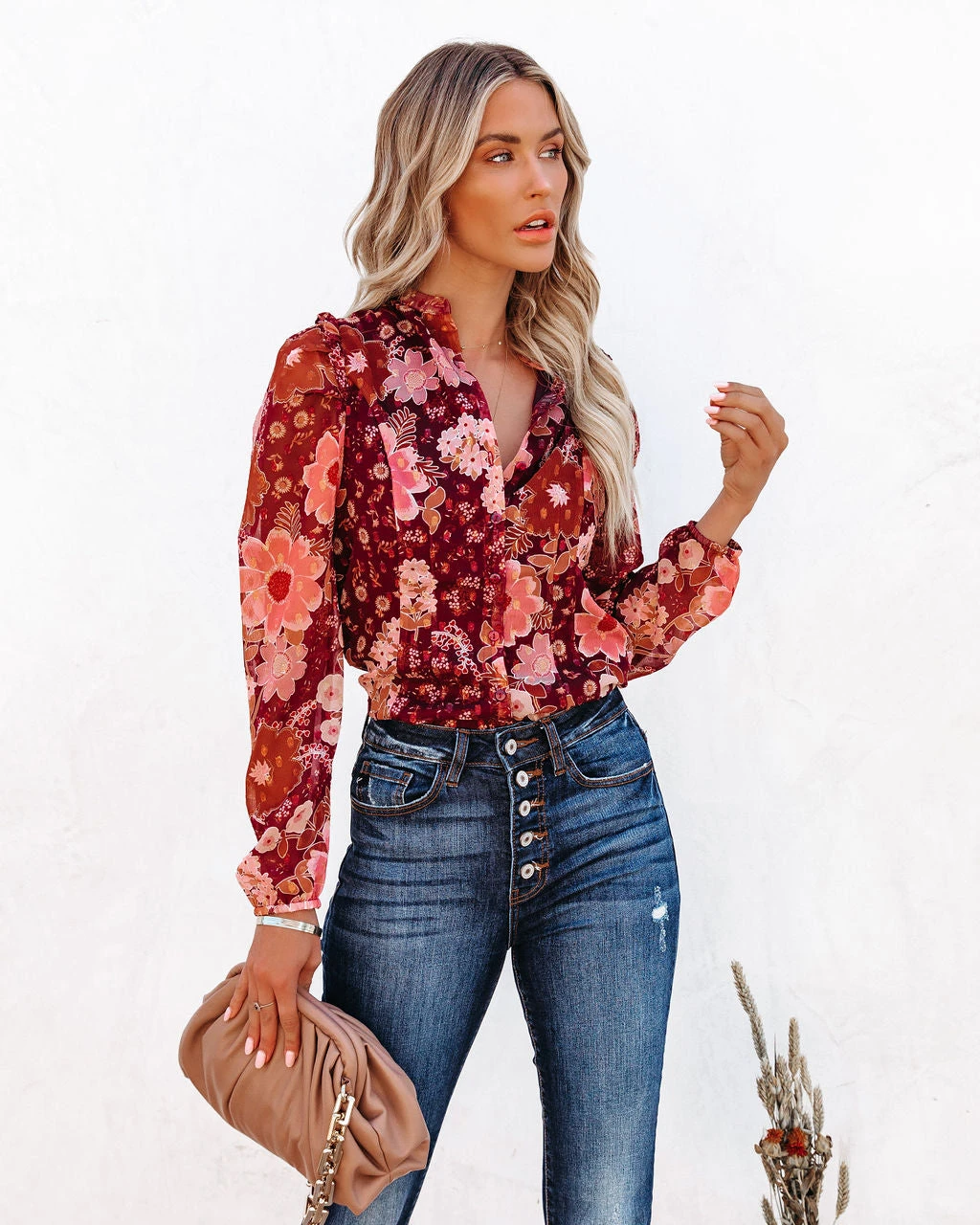 //VICI Exclusive// Our Four Seasons Floral Shimmer Bell Sleeve Blouse is so 70’s! This burgundy, blush, burnt orange, wine, and gold floral top features long sleeves. Finished with a split neckline. Styled with the Mercury Hoops, 5 Disc Choker, The Buddha Wheel Necklace, Chic Crossbody Chain Pouch Bag, Tilley Frayed Ankle High Waisted Skinny, and Ritz Faux Suede Pointed Heel.