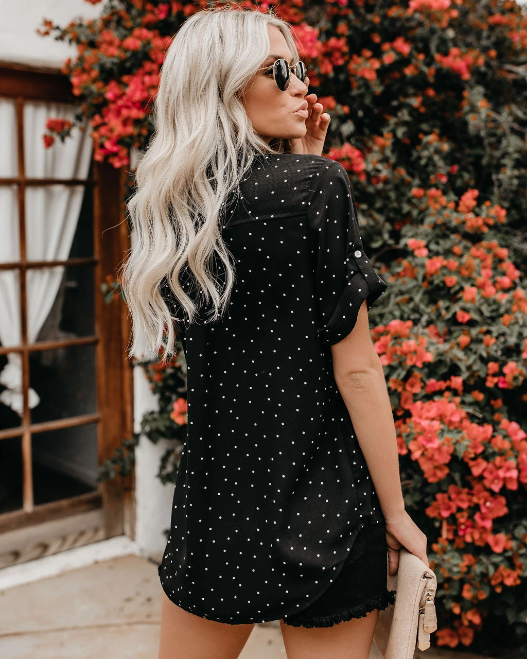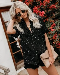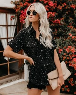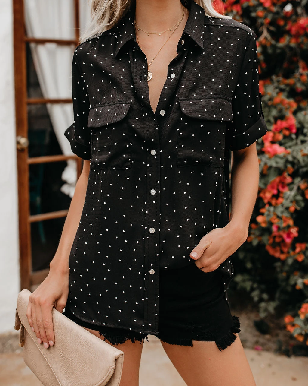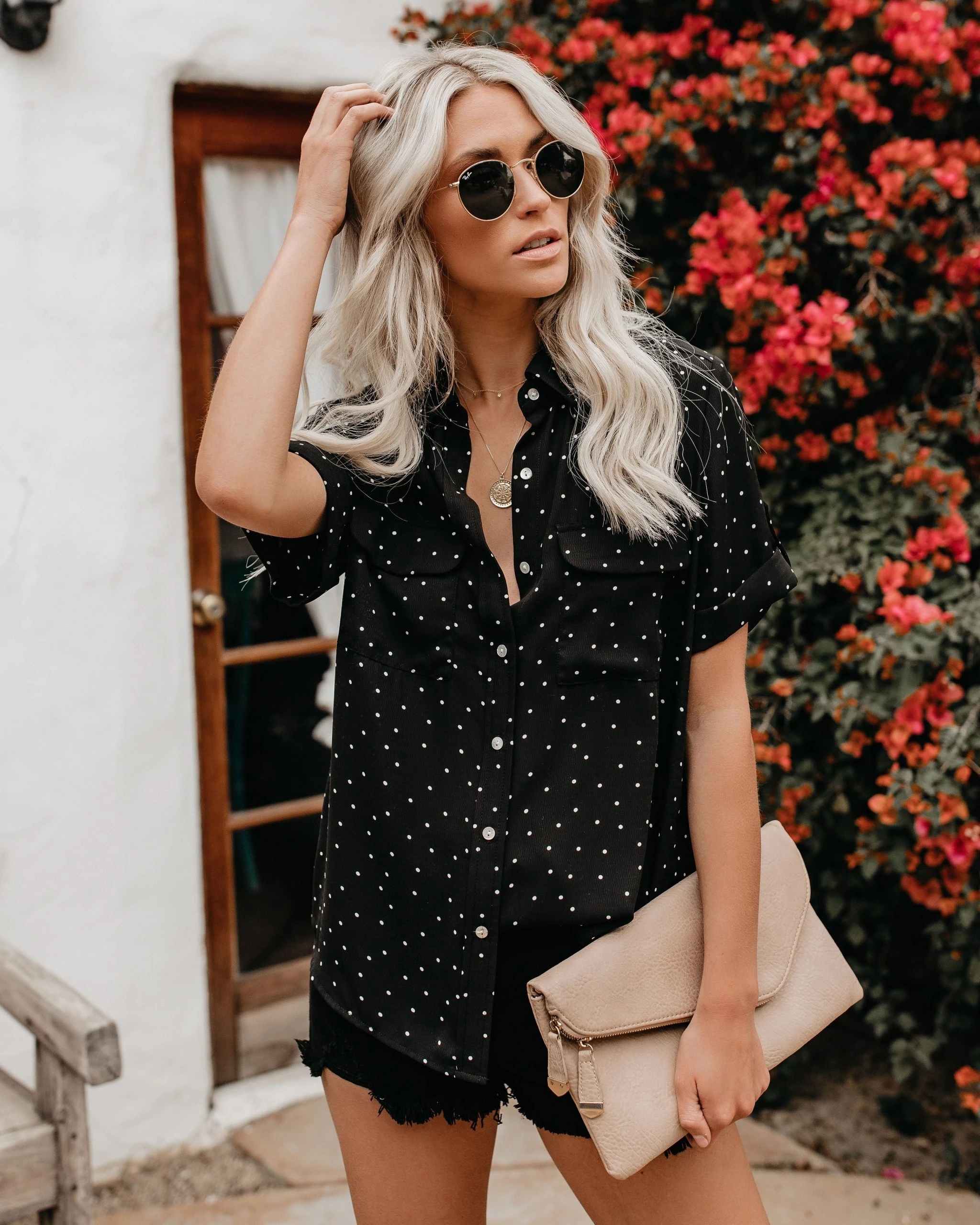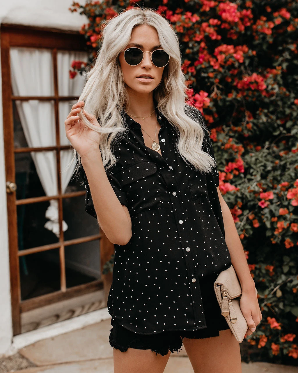 // Best Seller // New Color // We are loving the new black base color with the ivory polka dots! Our Close To Home Button Up Polka Dot Top is collared with roll tab sleeves and two flap pockets – functional details are the best details!