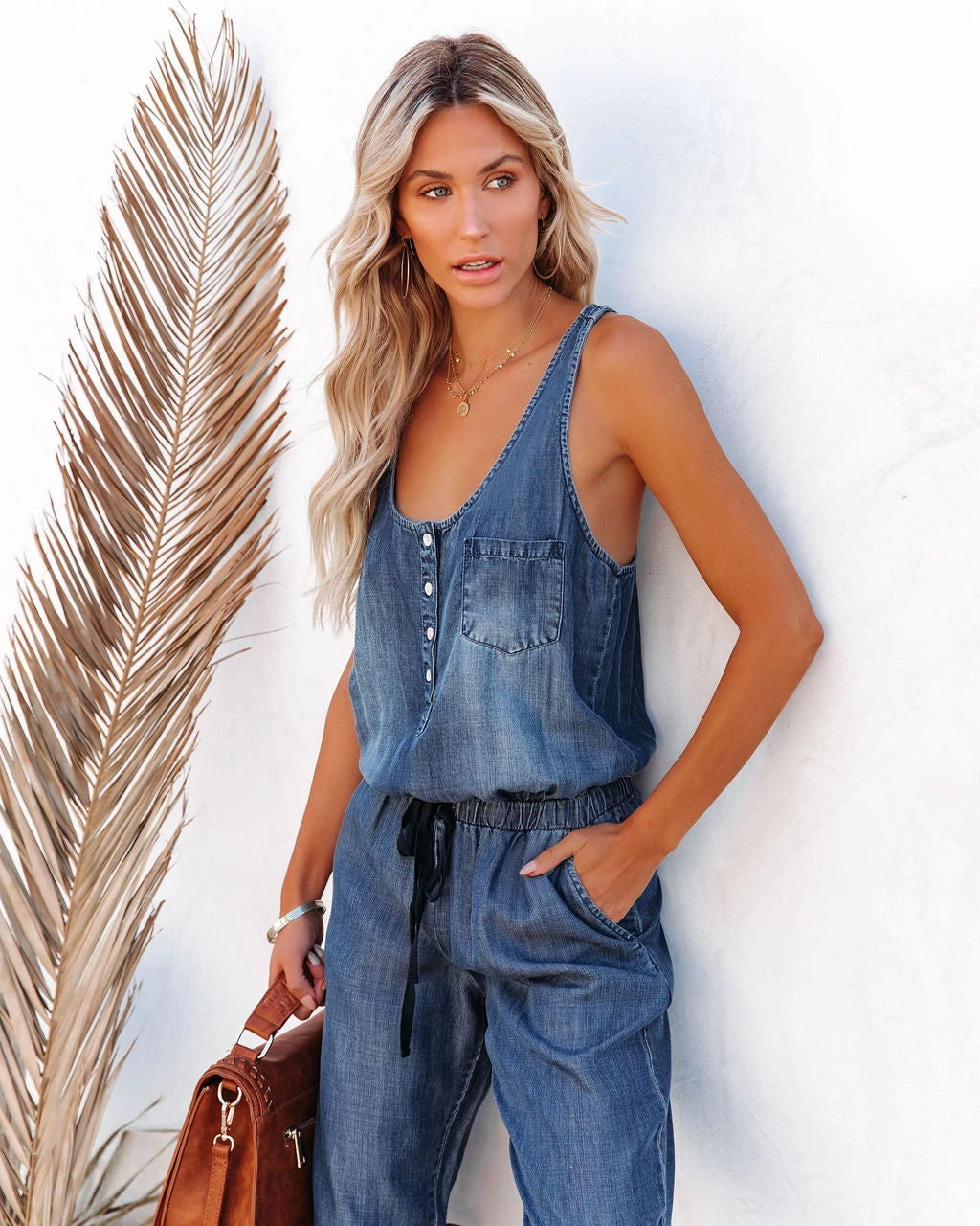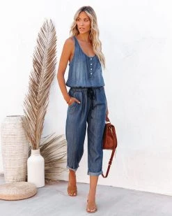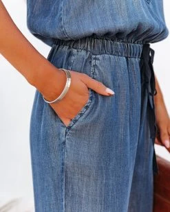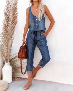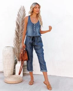 //Best Seller// New Wash// Casual never looked so good in our Jana Pocketed Tencel Drawstring Jumpsuit! This dark wash tencel jumpsuit has a scooped neckline and fixed tank straps. Finished with an elastic drawstring waistband and bust + side pockets. Styled with the Perfect Hoop Earrings, 5 Disc Choker, Chloe Mini Necklace, Emperor Coin Necklace, Simple Bangle Bracelet, Highland Bag, and Airway Faux Leather Sandal.