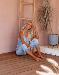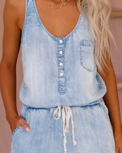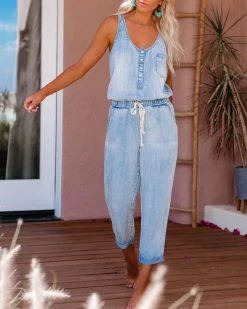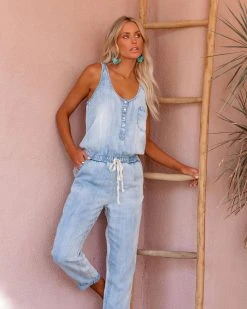 Casual never looked so good in our Jana Pocketed Tencel Drawstring Jumpsuit! This light wash tencel jumpsuit has a scooped neckline and fixed tank straps.