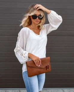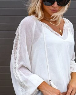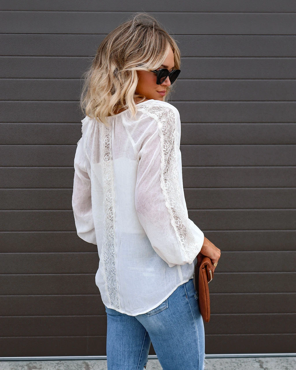 Go out to lunch in the Trinity Lace Chiffon Blouse in white that features a split neckline and a lace trimming.