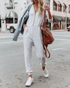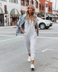 Lounge by the fire all day in our Vander Pocketed Hooded Knit Jumpsuit! This light grey jumpsuit is detailed with a hood. Designed with a tapered pant leg and side pockets. Finished with a front zipper closure. Styled with the Perfect Hoop Earrings, Chloe Mini Necklace, Initial Card Necklace, Simple Bangle Bracelet, Kenzie Backpack, Josie Pocketed Vintage Denim Jacket, and Common Thread Sneaker.