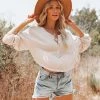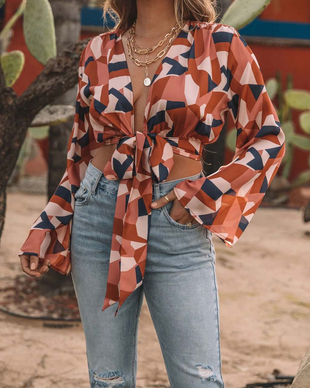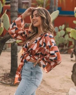 //VICI Exclusive// Our Ovie Printed Satin Tie Front Crop Blouse is ready for spring date night! Navy, coral, rust, and cream hues detail this dress. Designed with bell sleeves and a tie front. Styled with the Ana Gold Coin Lariat, Notion Layered Chain Necklace, Kason Distressed High Rise Denim, and Blair Faux Suede Strappy Heeled Sandal.