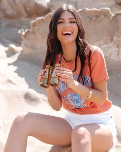 //VICI Exclusive// Look haute in the Hamptons in our Hamptons 1640 Cotton Tee! This terracotta classic fit tee features a white and cobalt blue graphic that reads “Hamptons, Est. 1640.” Just add white denim shorts and sandals! Styled with the Jodie Flat Hoops, Chloe Mini Necklace, Mosaic Coin Necklace, Simple Bangle Bracelet, Perry Ring, Baguette Ring, Lexi Chain Ring, Santa Cruz High Rise Distressed Denim Shorts, and Airway Faux Leather Sandal.