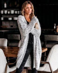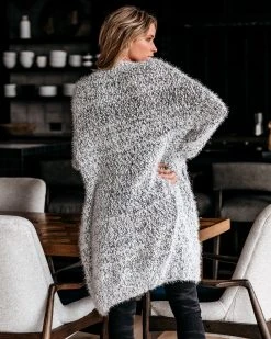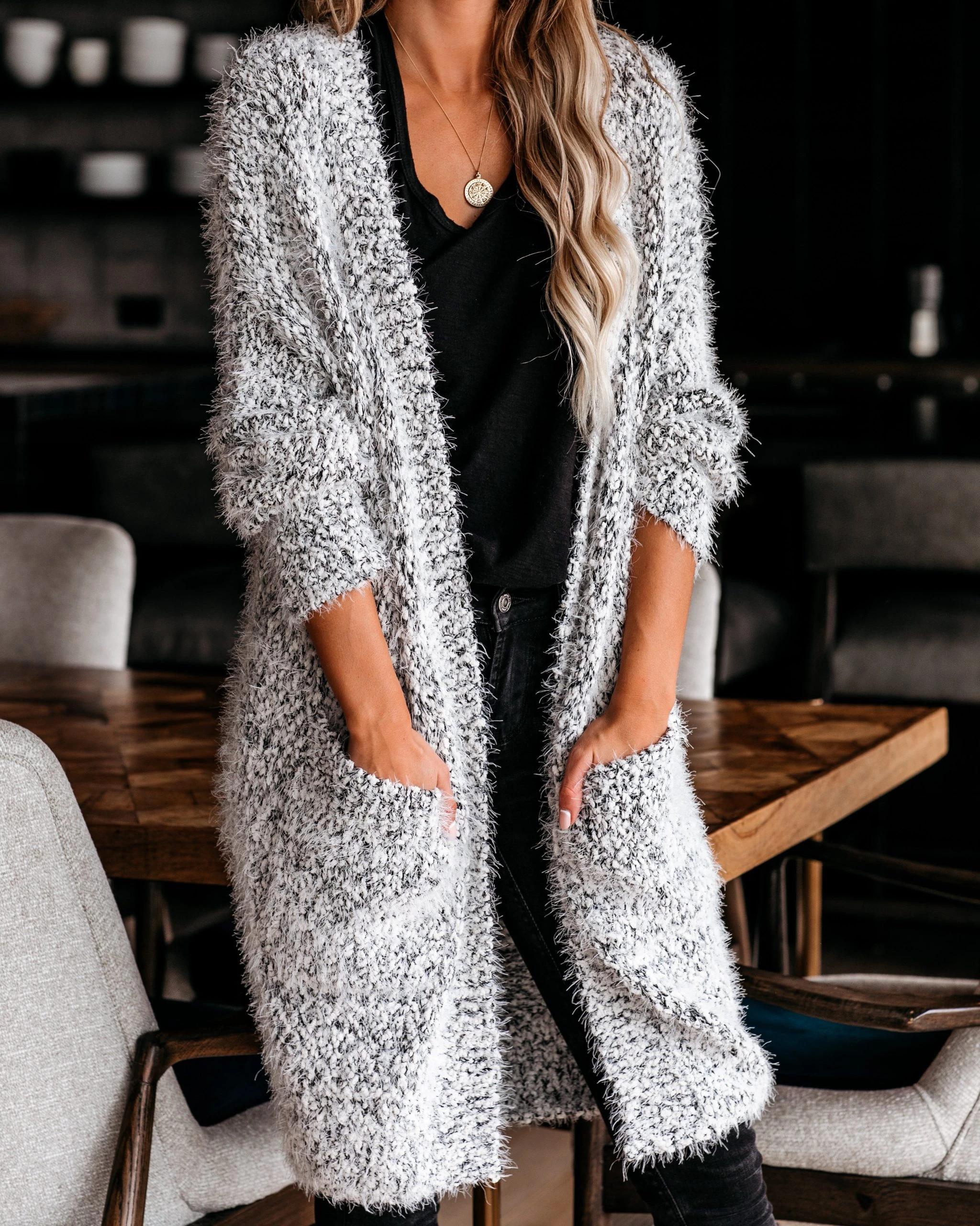//Best Seller//Our Hit The Slopes Pocketed Fuzzy Knit Cardigan is a carefree layering piece with a cool extended length. Crafted in an off white and black chunky knit fabrication with an open front and long sleeves. Fit with long sleeves front pockets – stylish + functional! A cozy layering cardigan to upgrade your look.