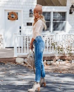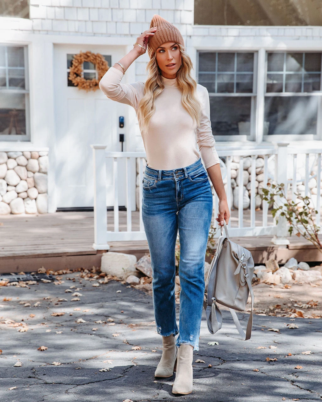 The name says it all! Layer our Layer It Mock Neck Knit Top under blazers and cardis. This ecru colored top features a mock neckline and a fitted style. The ideal fall to winter top! Styled with the Chilly Ribbed Beanie, Perfect Hoop Earrings, Simple Bangle Bracelet, Kenzie Backpack, Hannah High Rise Straight Leg Denim, and Uptown Faux Suede Heeled Bootie.