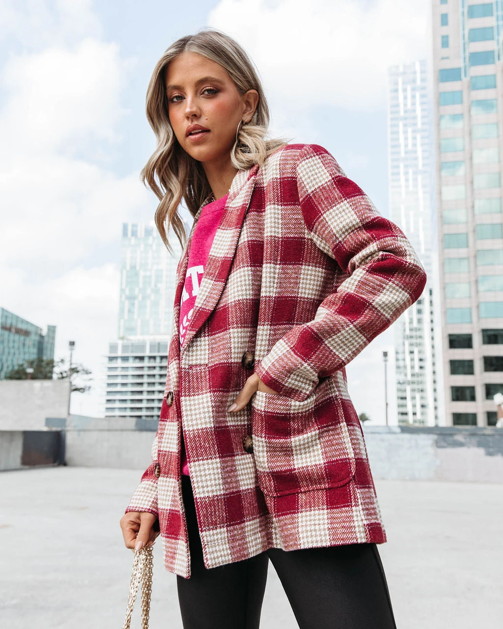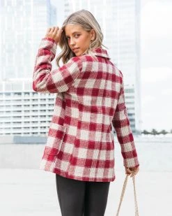 Get ready for the holidays in the Peppermint Dreams Plaid Blazer in burgundy that features a notched collar.