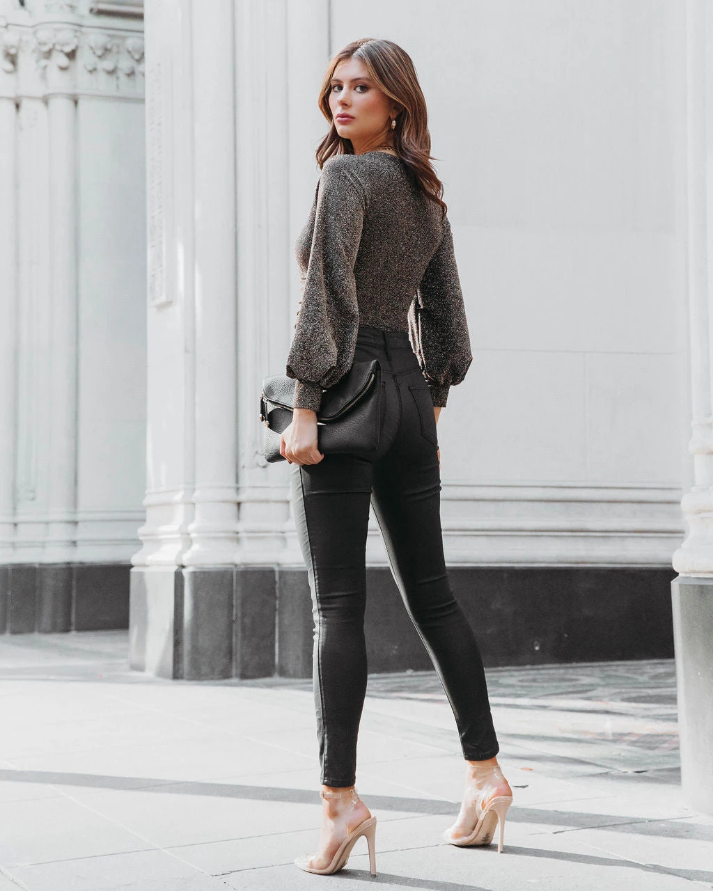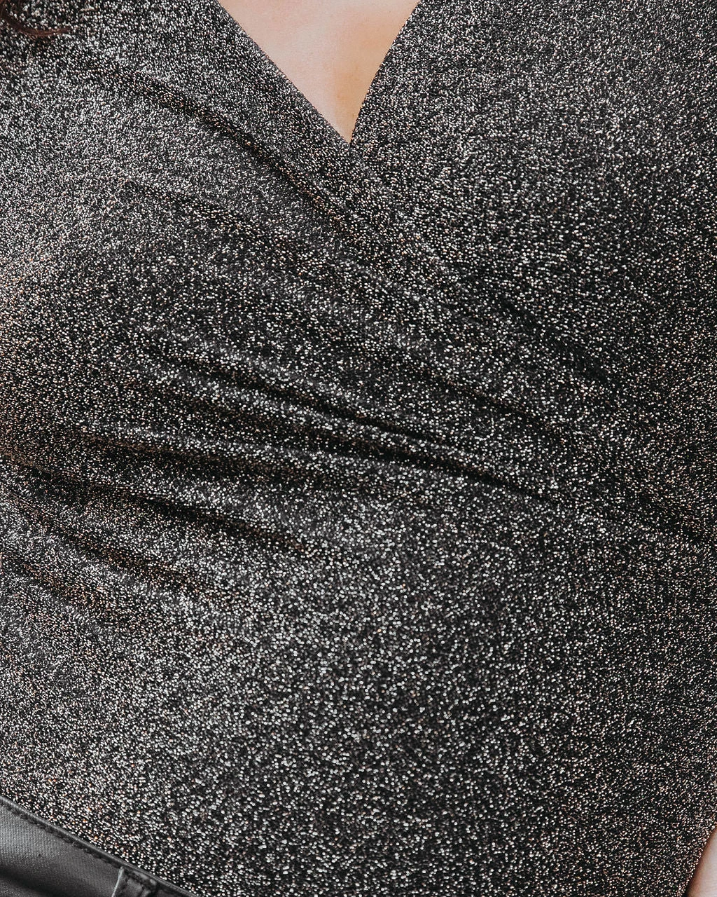 Prep for the holidays in the Shine Your Light Metallic Drape Long Sleeve Top in gold black that features a draped neckline.