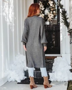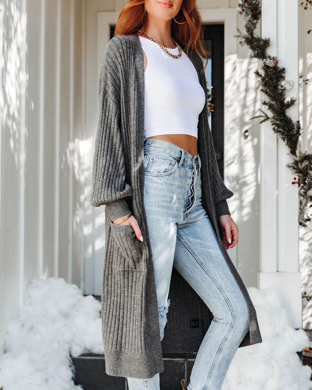 Add a layer of cozy in the Snuggle Me Up Ribbed Pocketed Cardigan in grey that features an open front.