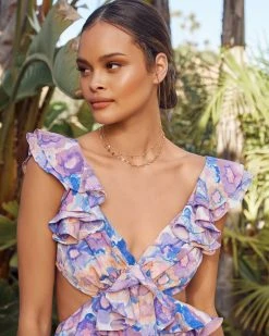 //Best Seller// Our Changing Tide Floral Ruffle Cutout Romper is made up of the most summer-y colors! Ivory, peach, blush, mauve, purple, and cobalt blue florals make up this cutout romper. Cascading ruffles adorn the front.