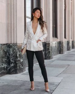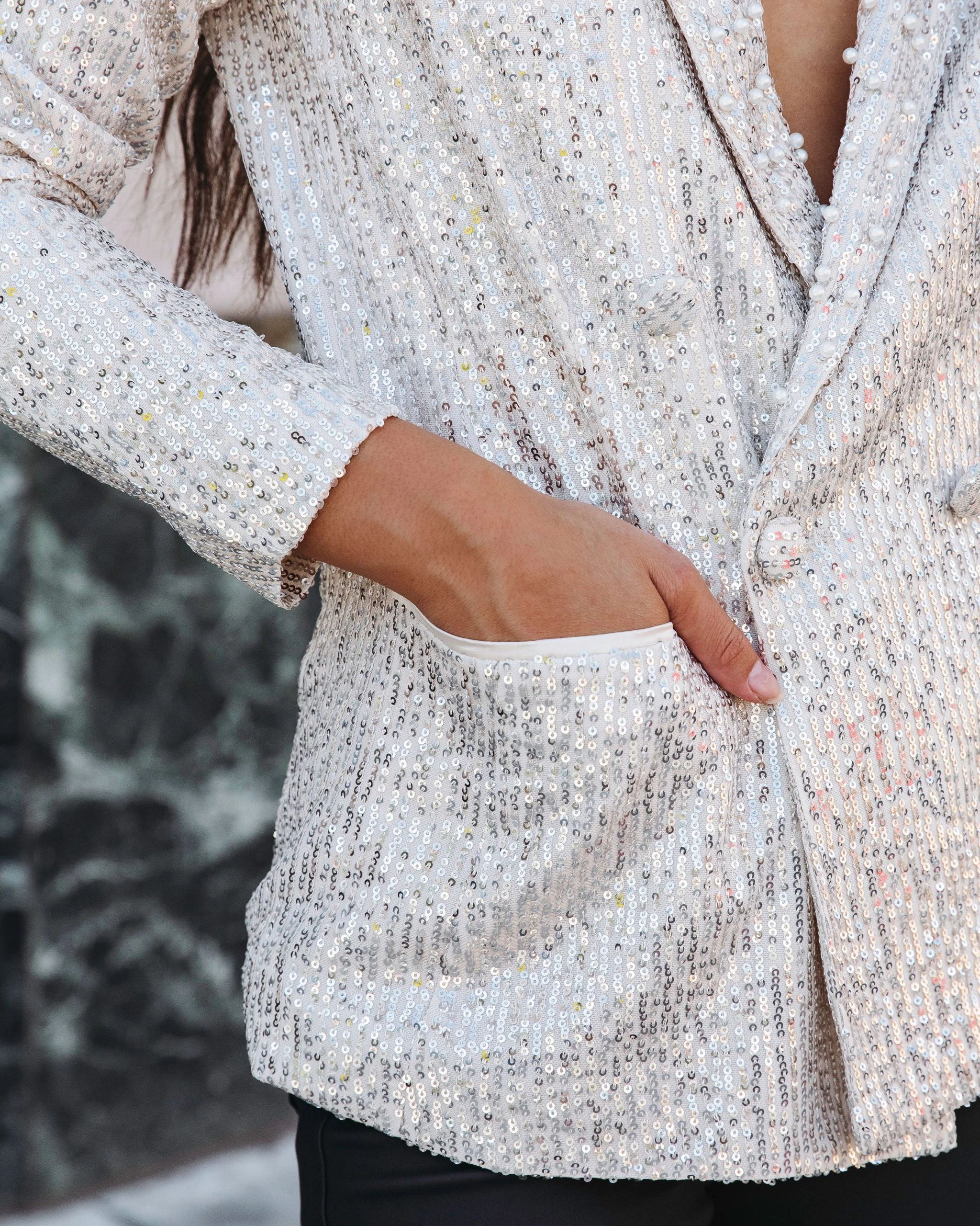 Stand out from the crowd in the Friday Spotlight Pocketed Sequin Pearl Embellished Blazer in silver that features a slip pocket.