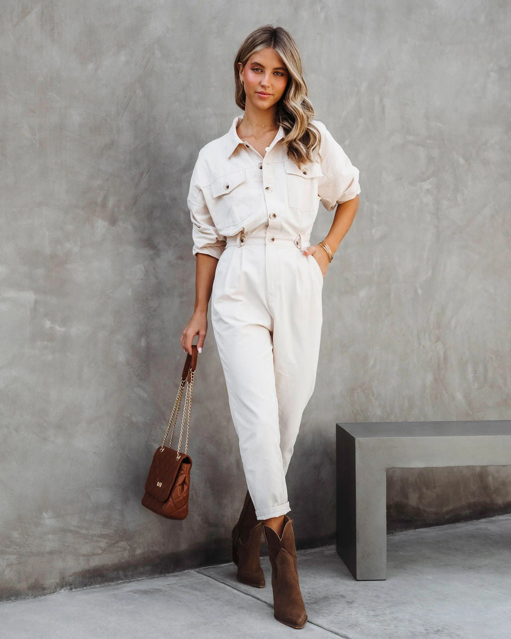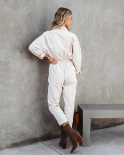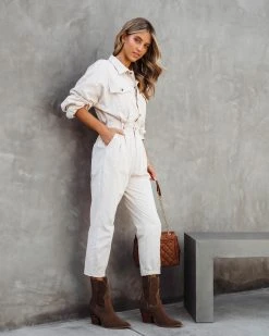 Cool girls will love the Understated Utility Cotton Pocketed Jumpsuit in ecru that features a straight leg.
