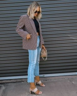 A wardrobe essential, the Daily News Plaid Pocketed Blazer in burgundy and black features padded shoulders.