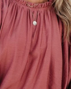 Sweet and simple, the Quinn Crinkle Ruffle Sleeve Top in dusty clay features a high neckline.