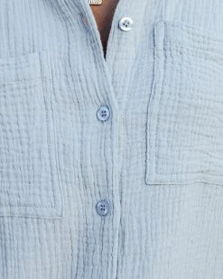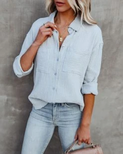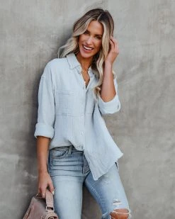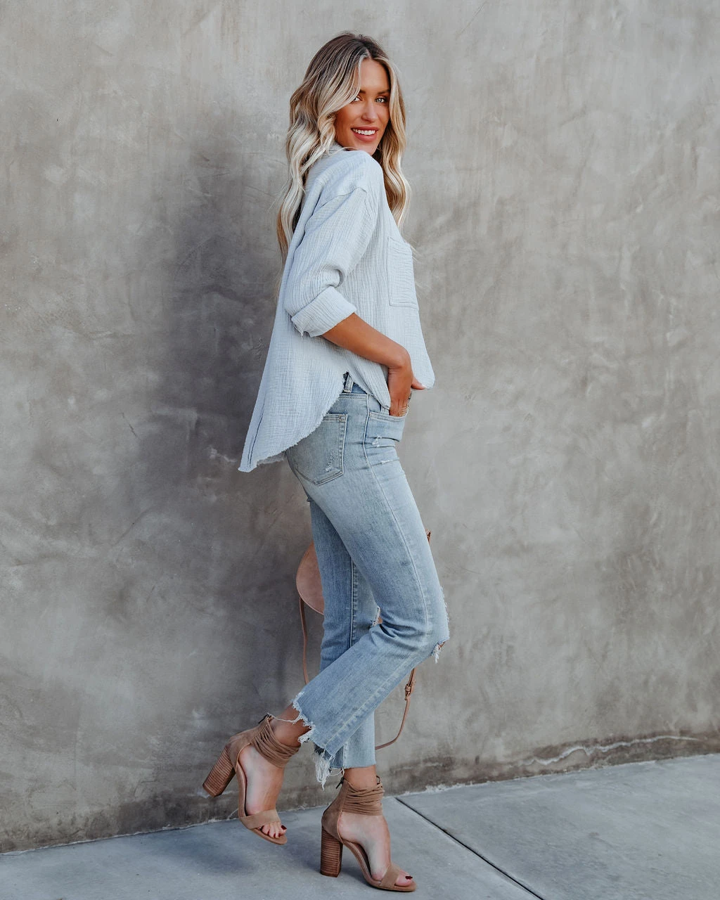 Our Cobie Cotton Frayed Button Down Top pairs so well with denim! This light blue cotton relaxed button down shirt is designed with a collar, frayed hemline and bust pockets. Button closures align the front. Styled with the Perfect Hoop Earrings, Chloe Mini Necklace, Initial Card Necklace, Mcguire High Rise Distressed Denim, Blair Faux Suede Strappy Heeled Sandal, and Highland Bag.