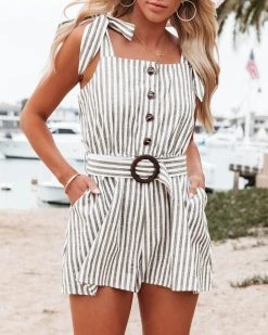 Look so adorable in the Cole Linen Blend Pocketed Striped Romper in olive that features a square neckline and side pockets.