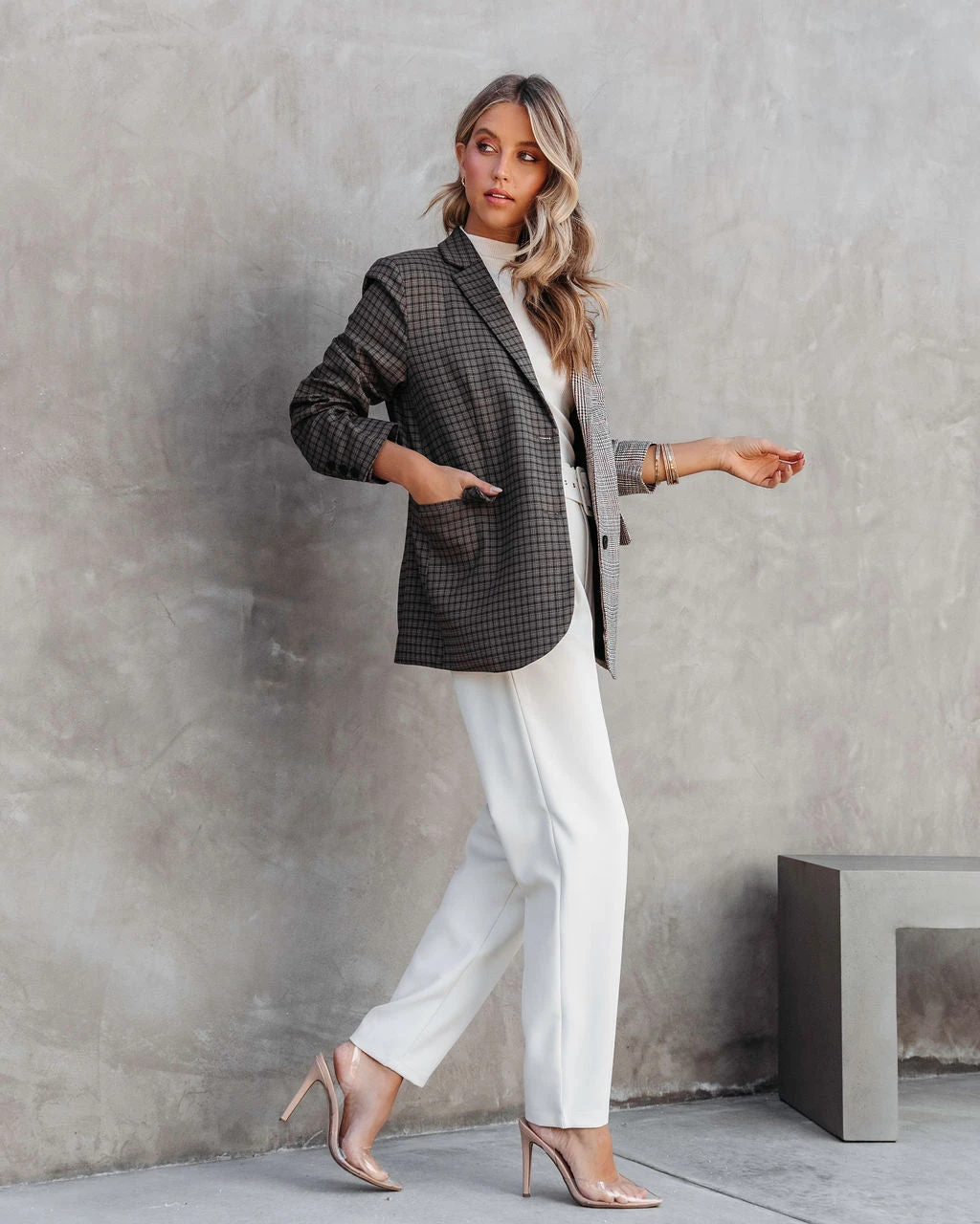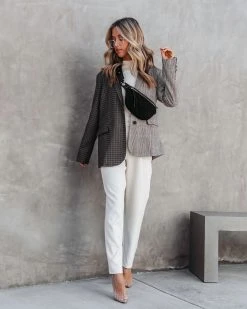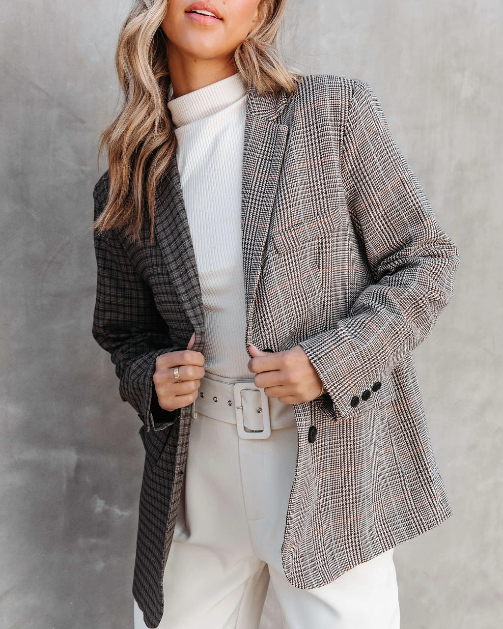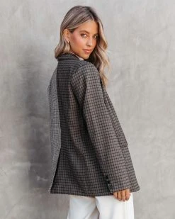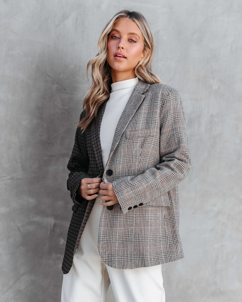 Fashionistas will love the Gemini Mixed Plaid Pocketed Blazer in brown that features flap pockets.