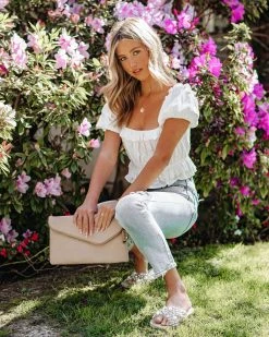 Make a statement with your sleeve in the Hana Cotton Eyelet Puff Sleeve Crop Top in white with a square neckline and an elastic waistband.