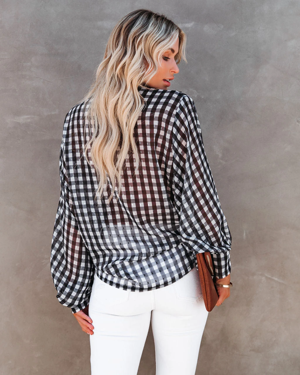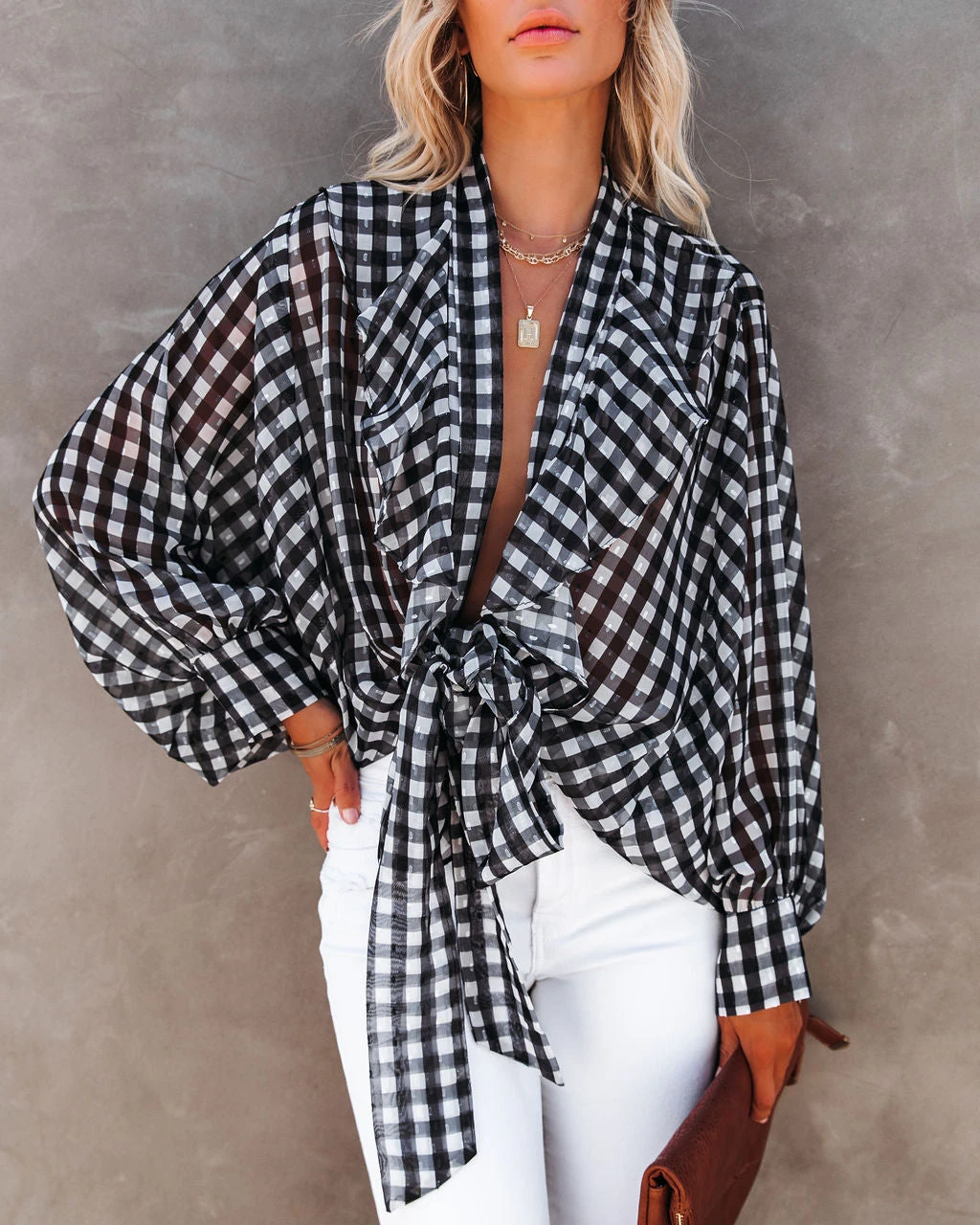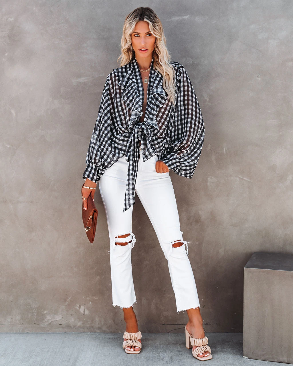 //Best Seller// Our Huntsville Gingham Ruffle Tie Blouse is so unique! This navy and white relaxed gingham blouse features a plunging ruffle trim front. Designed with dolman sleeves and a front tie closure.