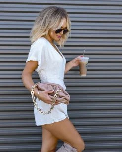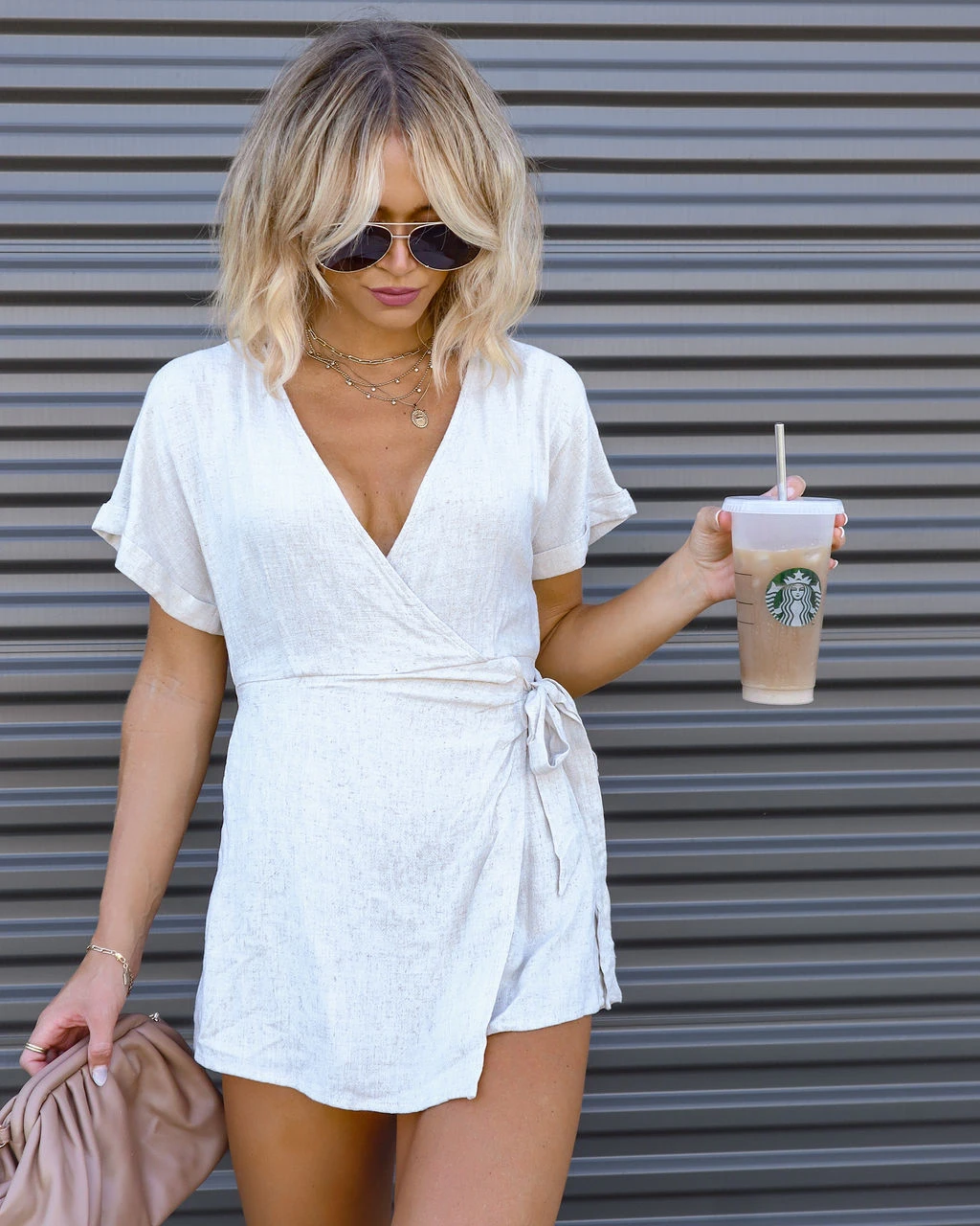 Girls weekend approved, the Lauren Side Tie Romper in oatmeal features a wrap waist tie.