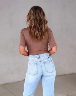Every closet needs the Morrison Twisted Front Tee in mocha that features a cropped fit.