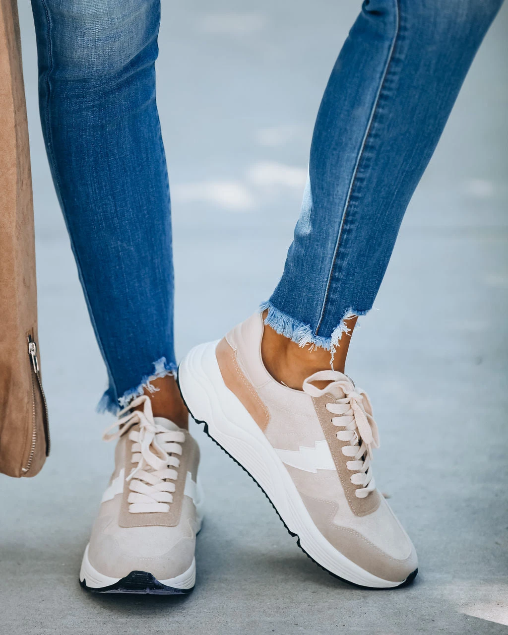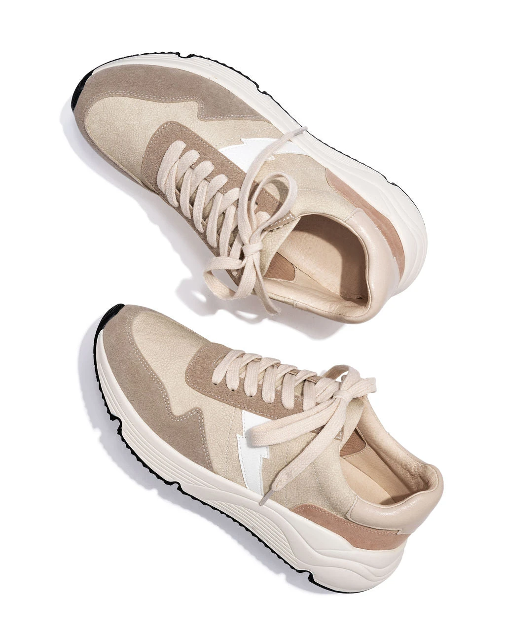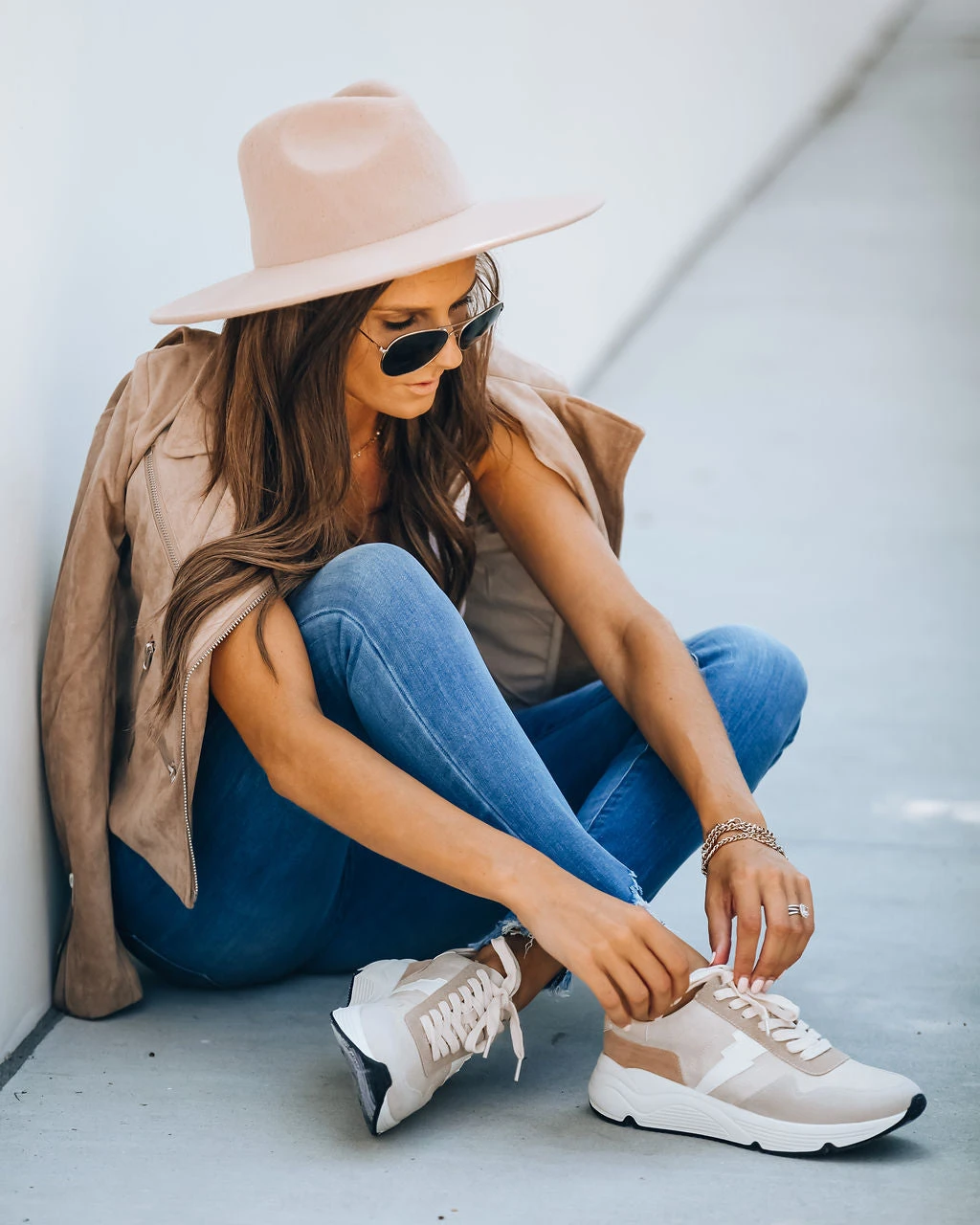 We’re putting a fashion forward twist on an athletic style with our Bolt Running Sole Sneaker! Panels of cream, mocha, taupe and blush faux leather + suede come together to create a chic look! Finished with a thick running sole and cream laces. Styled with the El Dorado Hat and Market Jacket.