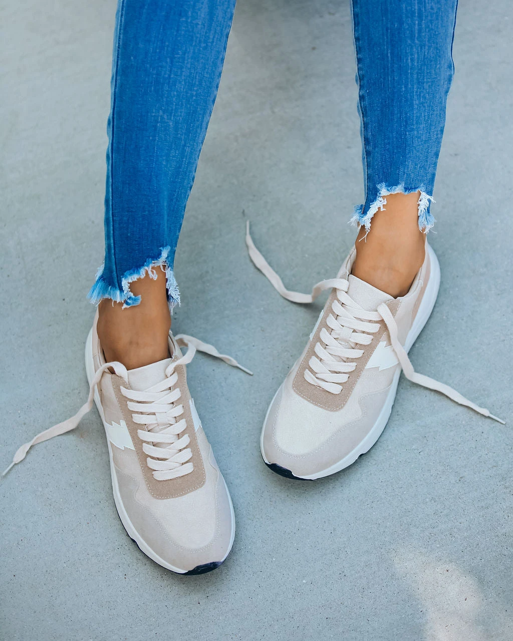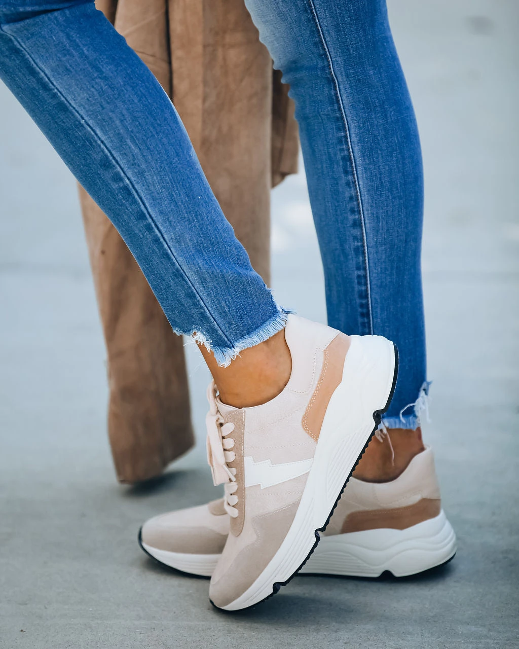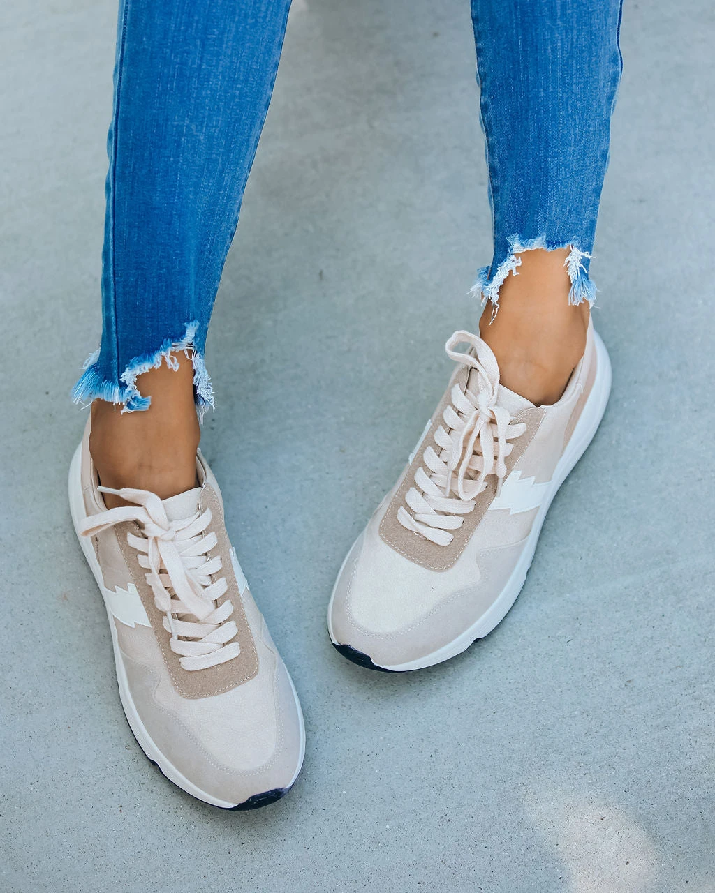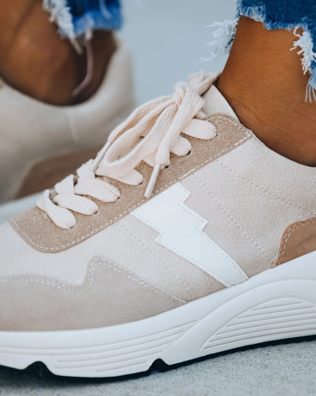 We’re putting a fashion forward twist on an athletic style with our Bolt Running Sole Sneaker! Panels of cream, mocha, taupe and blush faux leather + suede come together to create a chic look! Finished with a thick running sole and cream laces. Styled with the El Dorado Hat and Market Jacket.