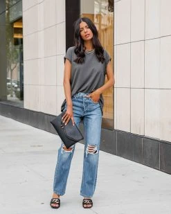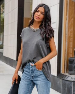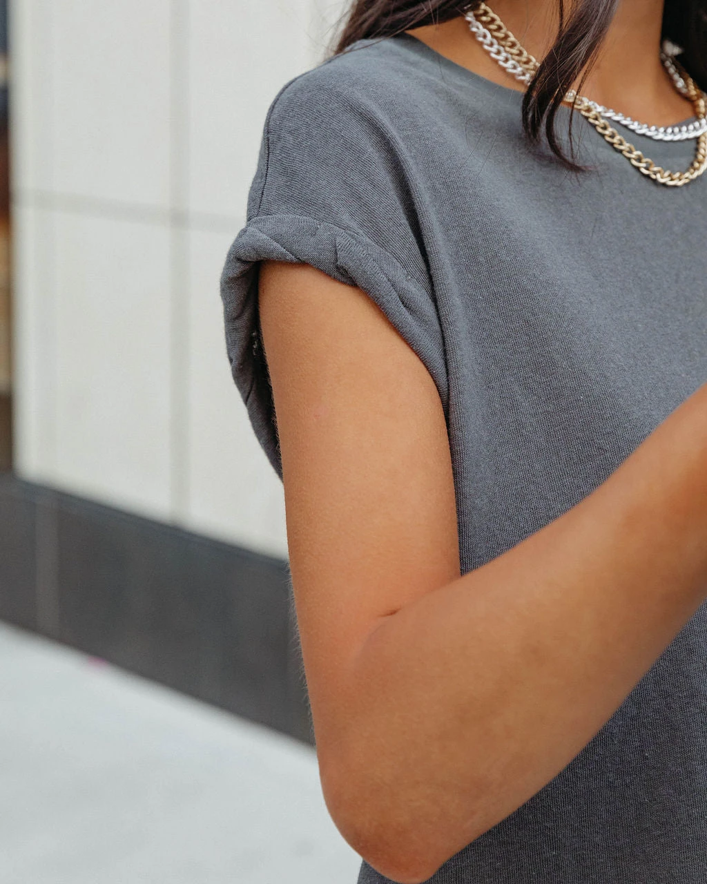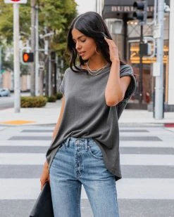 Effortless and easy, the Cambrie Cotton High Low Tee in charcoal features sewn cuffed short sleeves and a high low hemline.