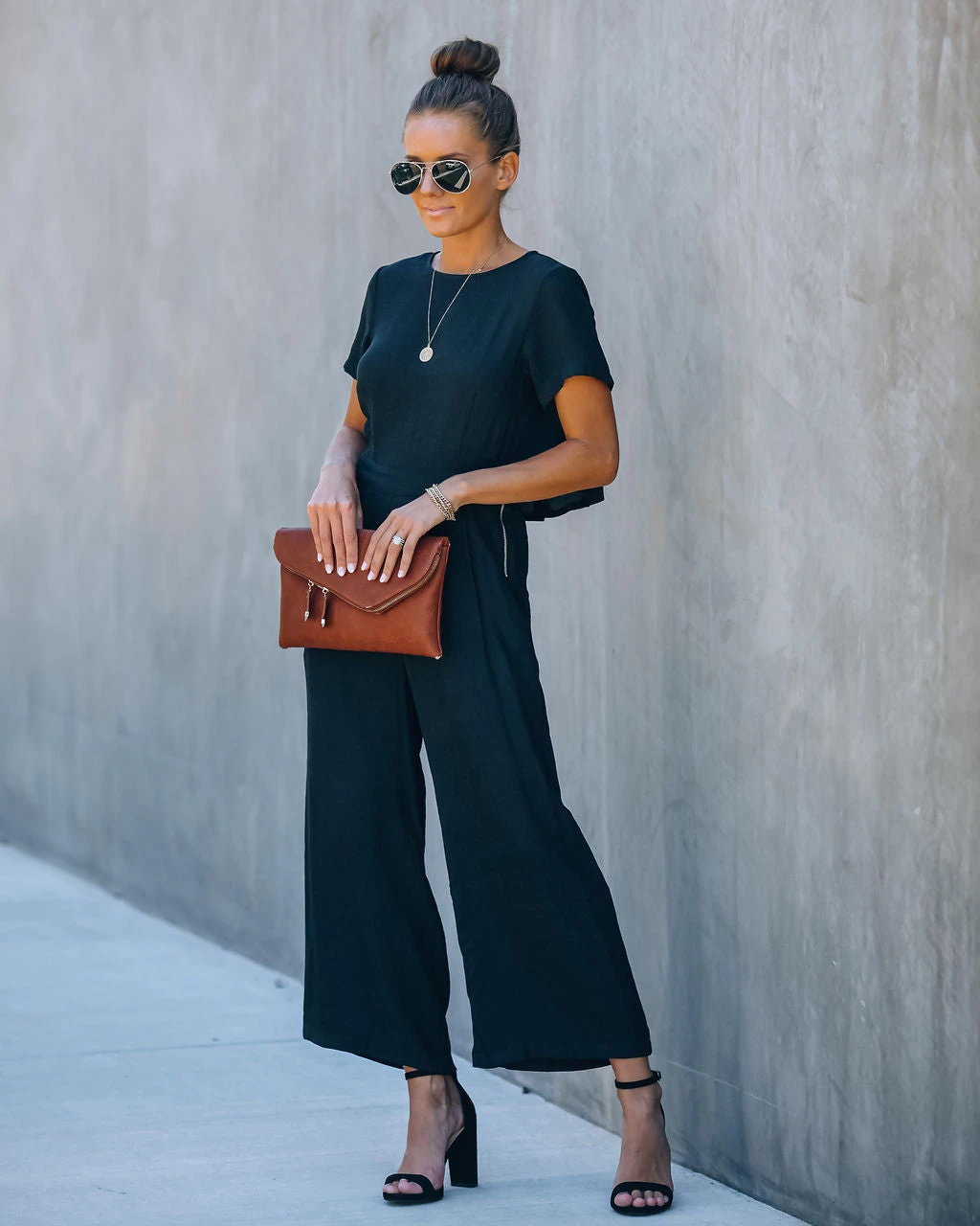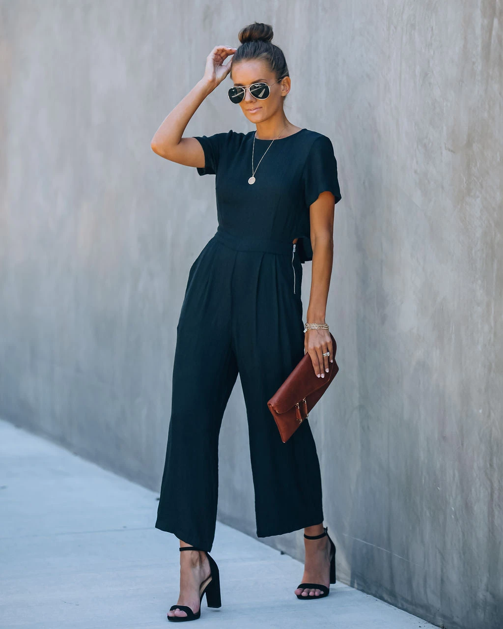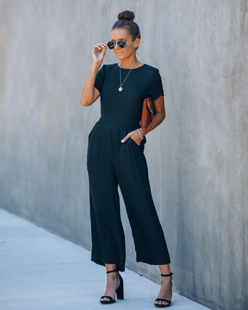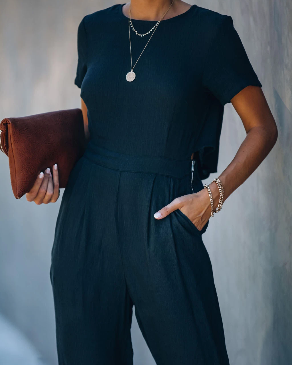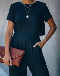 //Best Seller//New Color// First Class Pocketed Jumpsuit offers a leisure style with an elevated appeal! Feel good about your day in this black one-piece that features a crew neckline and cinches in with a partially elastic waist. Two side pockets and wide cut legs keep the look functional and chic! Finished with an exposed side zipper and back button closures. Styled with The Buddha Wheel Necklace, Kelsey Chain Bracelet, Royale Heels and the Stella Crossbody Envelope Zip Clutch.