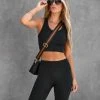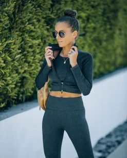 Spend Saturday’s sweating it out in this adorable workout set! Our Sculpt Ribbed Knit Zip Up Crop Jacket looks fire paired with the matching leggings, tank, and a pair of sneaks. This washed black ribbed knit jacket has a cropped fit and a high neckline. Styled with the Chloe Mini Necklace, Shield Pendant Necklace, Windbreak Nylon Sling Bag, Sculpt Ribbed Knit Seamless Legging, Sculpt Ribbed Knit Crop Tank, and Mindful Faux Leather Running Sole Sneaker.