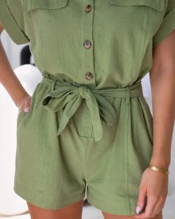 Embrace utilitarian style in the Adventure Seeking Cotton Utility Romper in safari green that features front button closures.