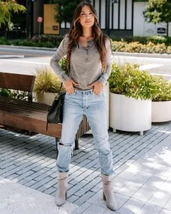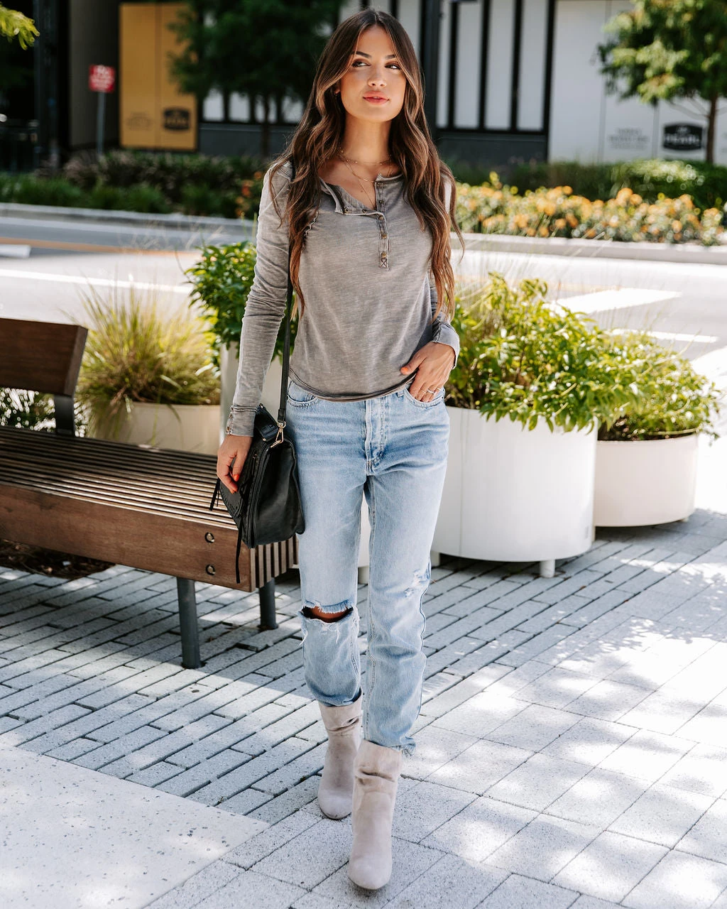 Comfy meets classic in the Daralynn Cotton Long Sleeve Henley in washed grey that features snap button closures.