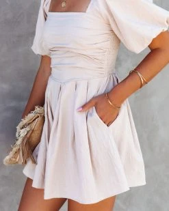 Chic and cute, the Look Away Pocketed Puff Sleeve Romper in natural features a square neckline.